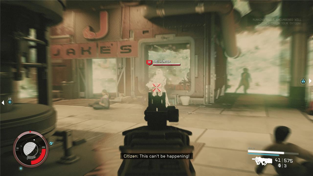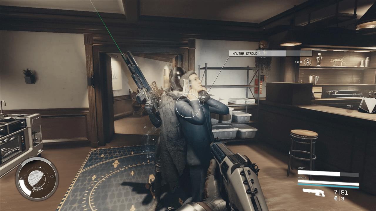 Eventually your objective will change to “check on Walter.” Head up to the bar, if you’re not there already, and you’ll see old Walter getting choked out by a mysterious, invisible individual. Wait for the individual to push Walter over and then start blasting.