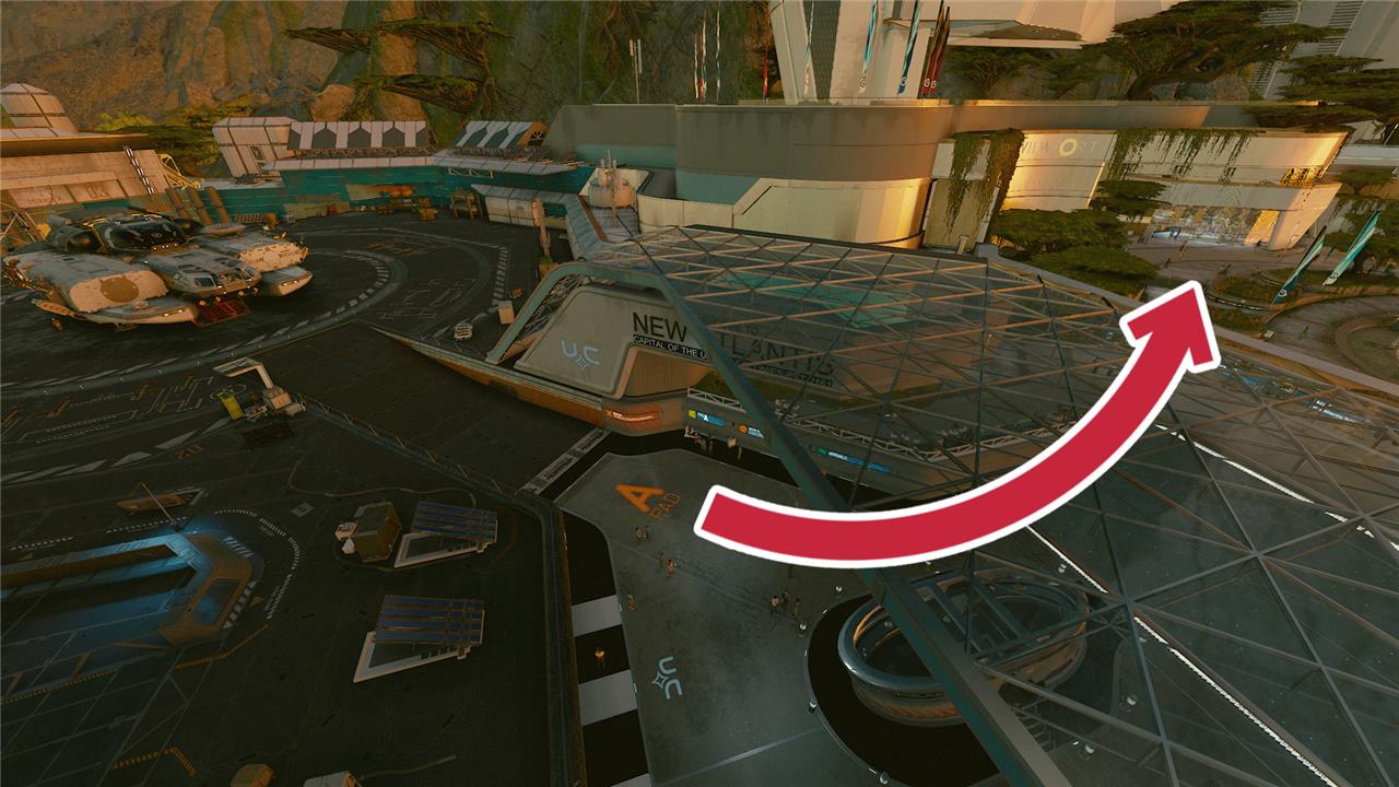 When you land in the New Atlantis spaceport (on the planet Jemison in the Alpha Centauri system), walk forward, go down the ramp, and through the glass awning.