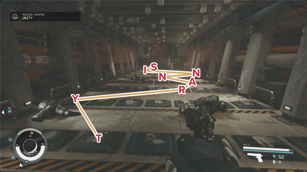 When you reach the corridor Livvey told you about, you’ll see a hall with lettered panels on the floor. There are eight rows with seven letters in each row. Stepping on a wrong letter in any row will trigger a set of four level 46 automated turrets to fire on you.