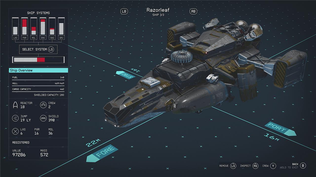 The Razorleaf starship is well-equipped and well-armed. It’s better than the Frontier (your default ship from way back in the “One Small Step” mission) in every stat except ballistic weaponry.