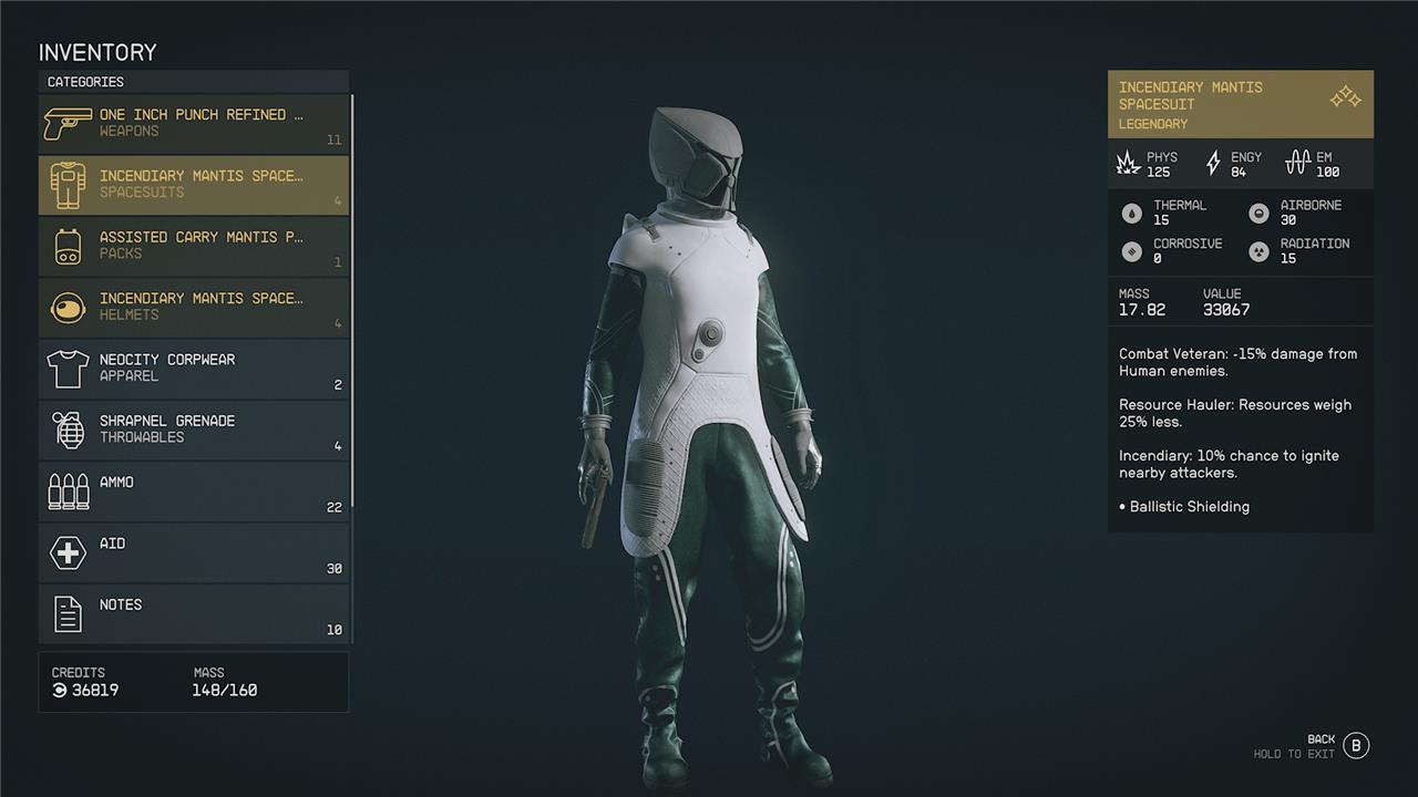 - The Incendiary Mantis spacesuit comes with both the resource hauler (resources weigh 25% less to aid carry capacity) and the incendiary (10% chance to ignite nearby attackers) traits.