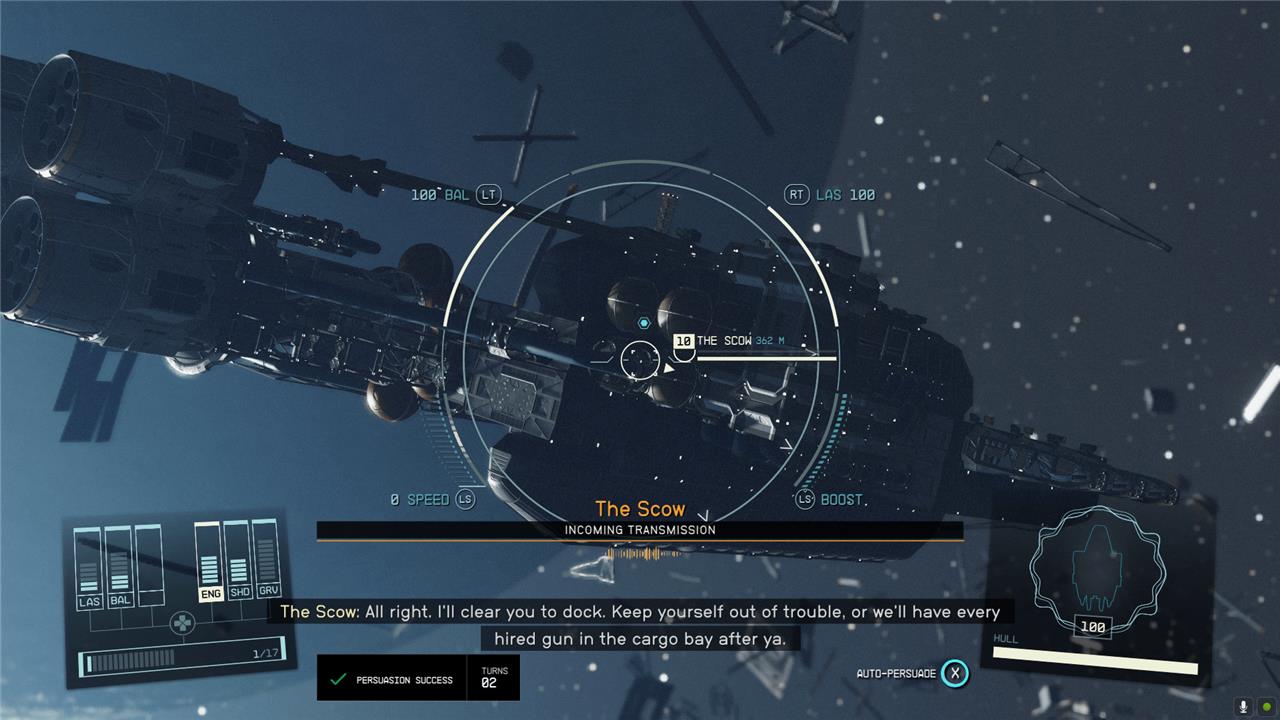 Hail the ship and use Persuade on the guy over the radio (it’s only a four pip check). If you let Barrett talk for you, it doesn’t go very well, as Petrov doesn’t seem to like him very much. (You’ll still get the chance to use the Persuasion option even if Barrett makes an ass out of himself, and it doesn’t make the check any harder, so pick it if you want a laugh.)