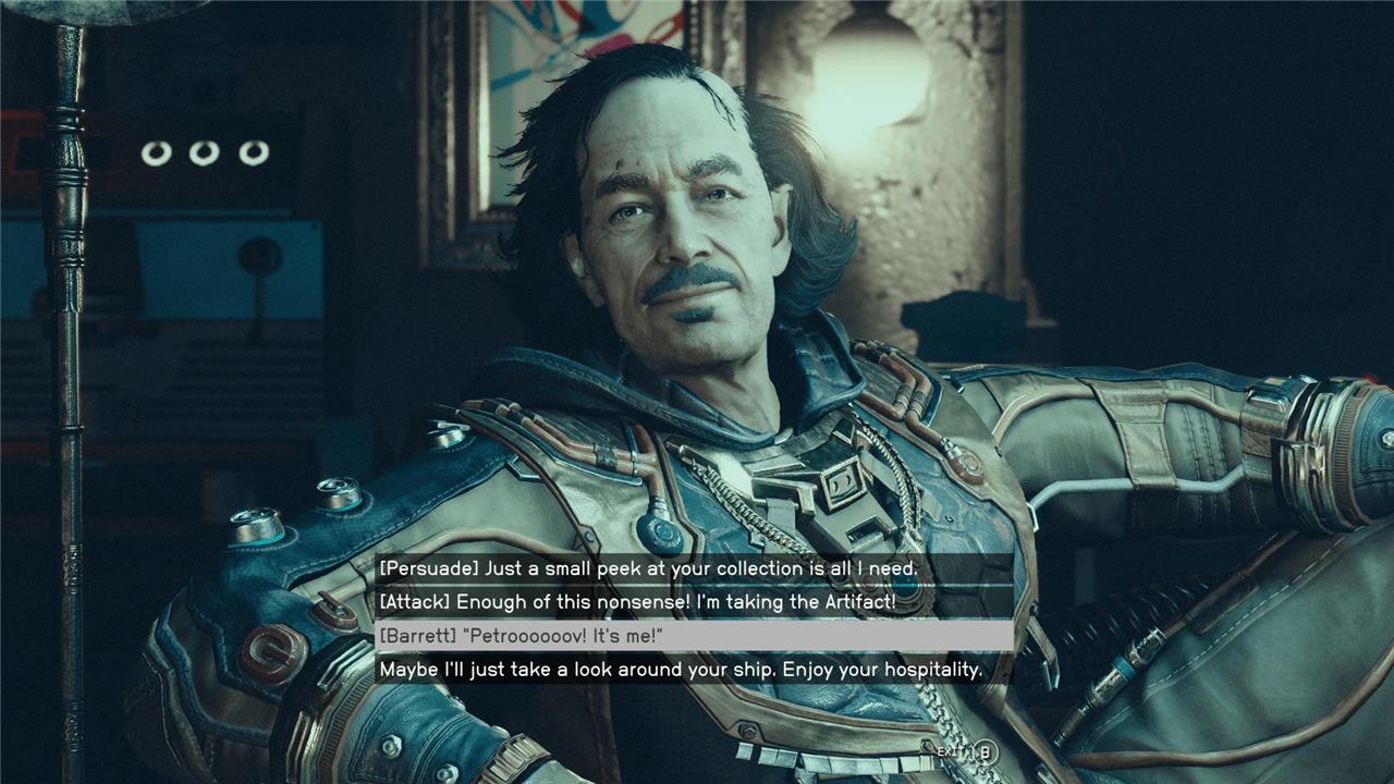 Appeal to Petrov’s ego by praising his reputation, his ship, or his collection. Flattery makes him more inclined to trust you and show off the artifact.