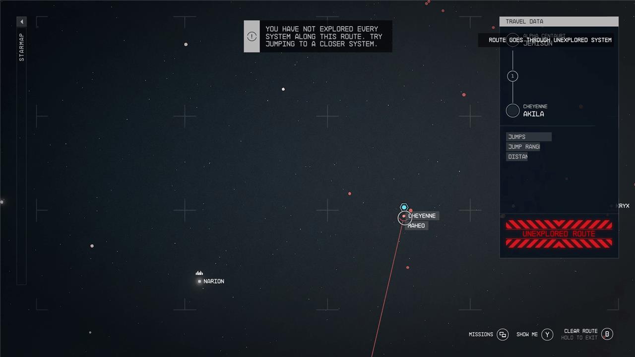 You might run into a problem when carting your way to Cheyenne: the “unexplored route” prompt. If the system is red, that means you haven’t traveled to a close enough system to make Cheyenne – and therefore Akila – active.