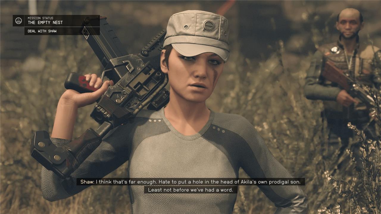 Where things get complicated is when the Ashta attack. Essentially space cougars, they’ll swarm the camp as soon as you finish talking to Shaw. You can help her out for a reward or you can leave Shaw to her fate. If you decide to help, keep in mind that if you accidentally hit one of her goons, she’ll turn on you instantly – even if you passed the persuasion check. If you’re using an explosive weapon, be especially careful, as even incidental splash damage can cause Shaw to turn on you.