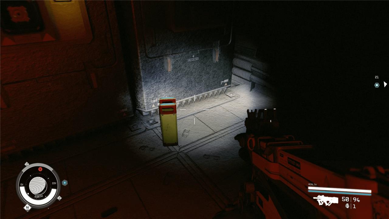 Head down the next hallway and take a left at the T junction. When you get to some stairs, go down them and insert the power cell into the generator near the big “NASA” sign on the floor. Go behind the stairs and grab another back-up power cell for later (it’s sitting on a cart).