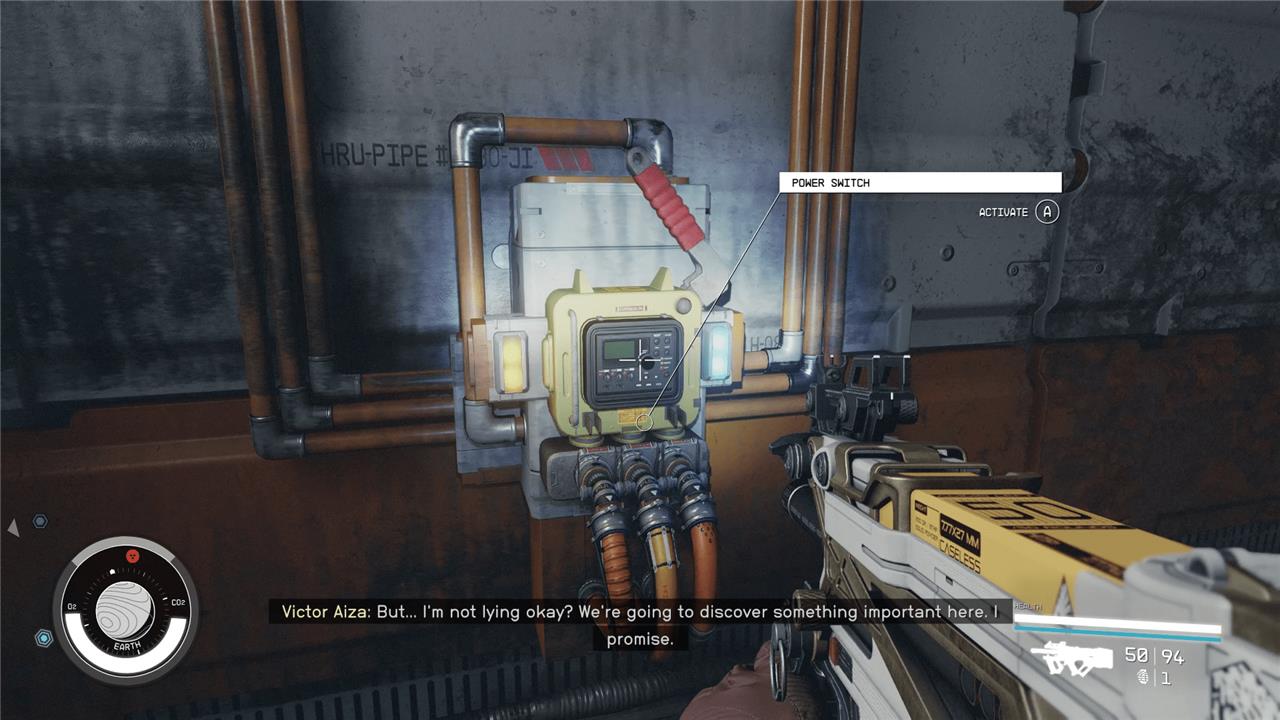 Follow the waypoint until you reach the area where you need power to get through the door. Climb up the rock on the left side of the room, go through the door, and follow the hallway until you reach the yellow door. Open it and flip the switch to turn on the power. Use the switch in the other room to open the emergency door.
