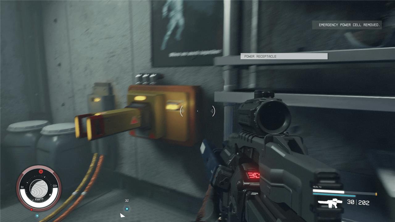 Grab both the emergency power cells (you’ll need more later) and plug one into the generator. Return to the elevator and take it down.