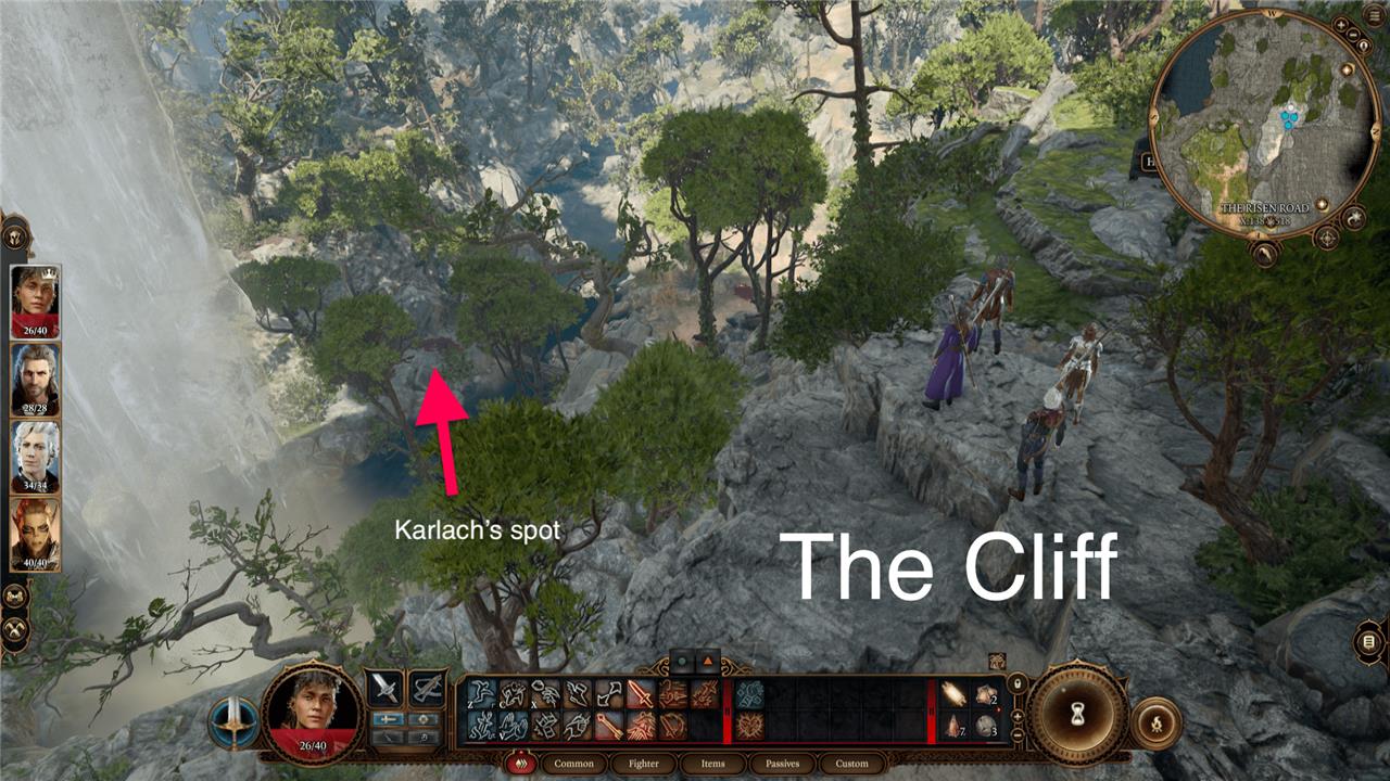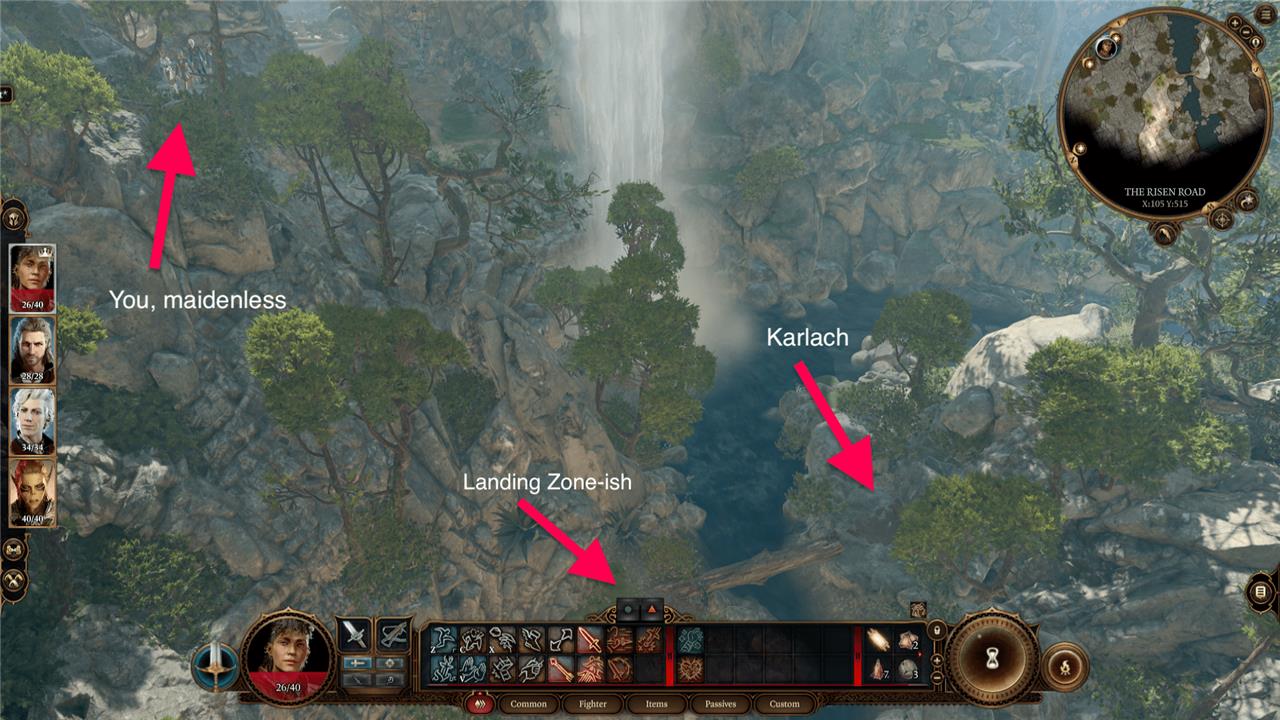 Put simply, the Karlach Cliffstrat takes advantage of a quirk of Baldur’s Gate 3’s map, which allows you to jump from a high cliff in the back of the Druid Grove directly to the valley stream where Karlach is stationed. This bypasses a long walk with several encounters and at least one really tough fight. Just getting to the Grove is a cakewalk in comparison – the hard part is surviving the landing.