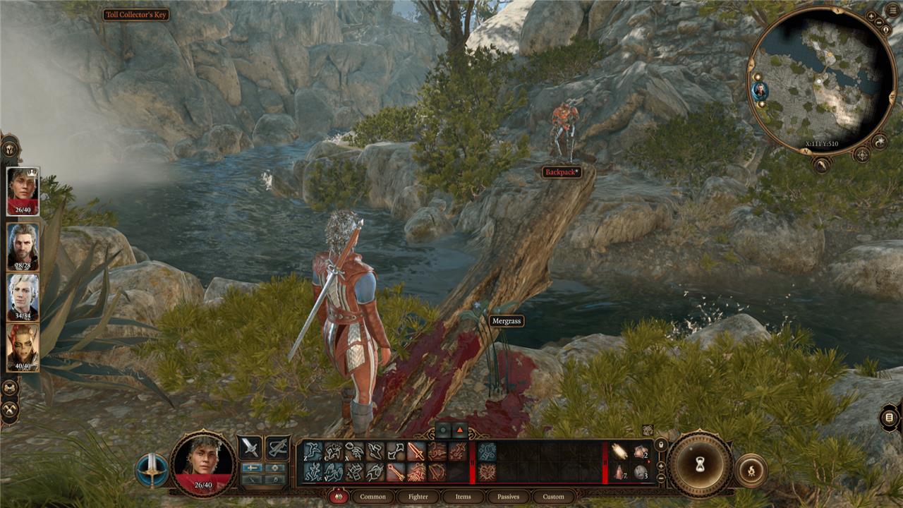 From here, depending on your draw distance settings, you may even be able to see Karlach. Even if not, rest assured, the patch of blood on the other side of that fallen log is where she will be stationed. Your landing zone is just north of the log, and if you select the Jump ability, the game will helpfully display exactly how much damage you’ll take when you hit the ground – a range of about 25 to 35 damage depending on your starting point and jump distance.
