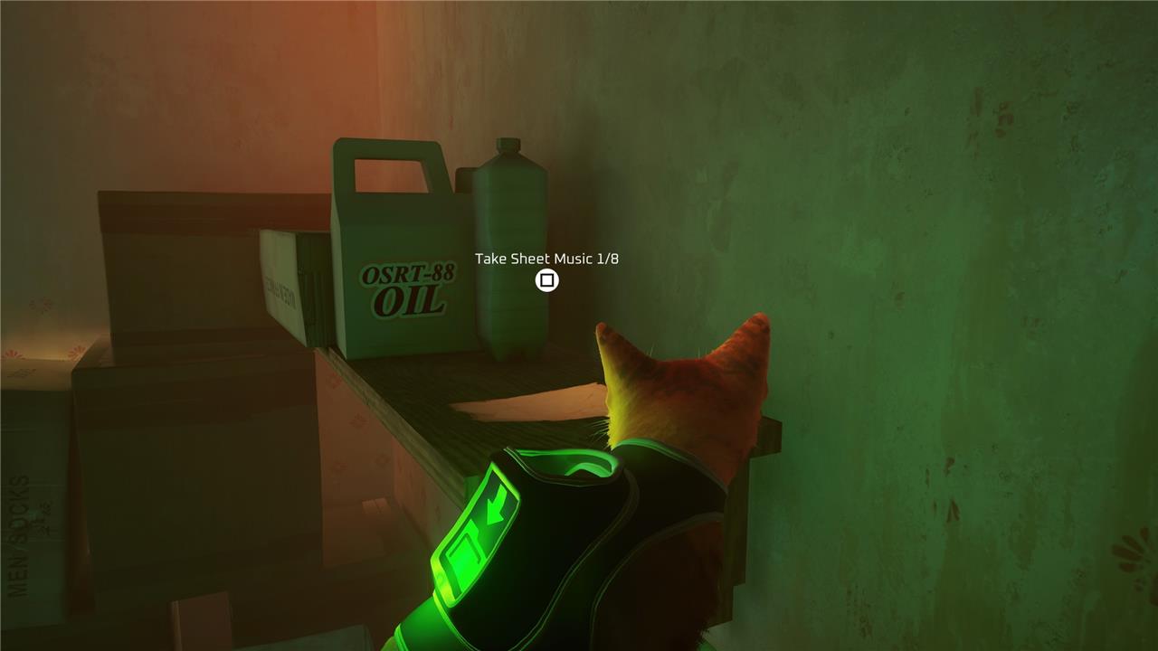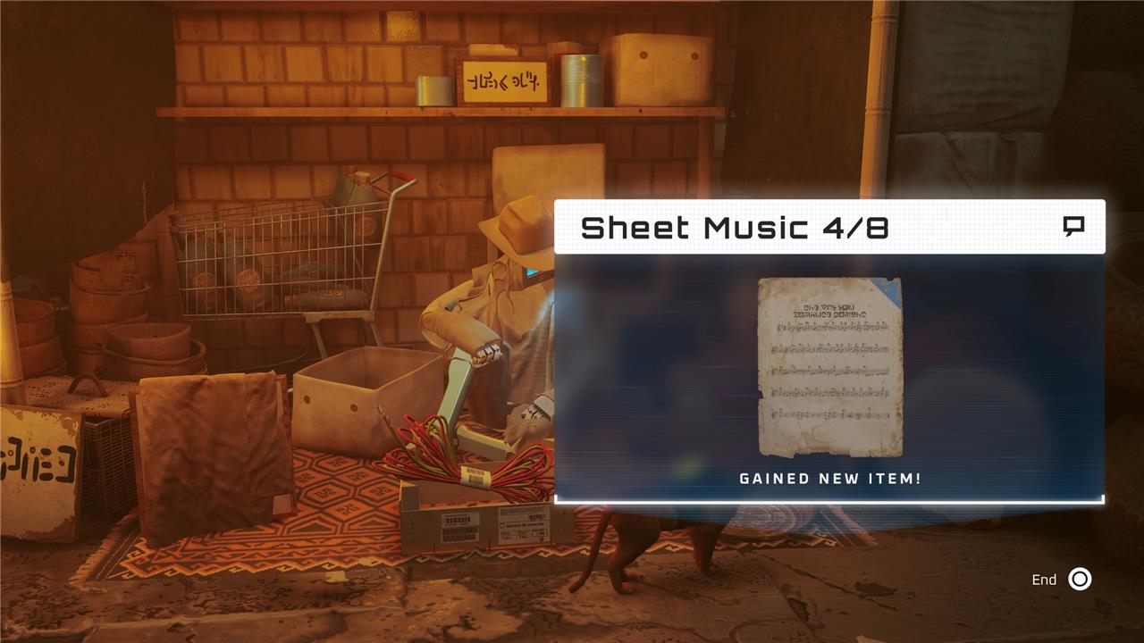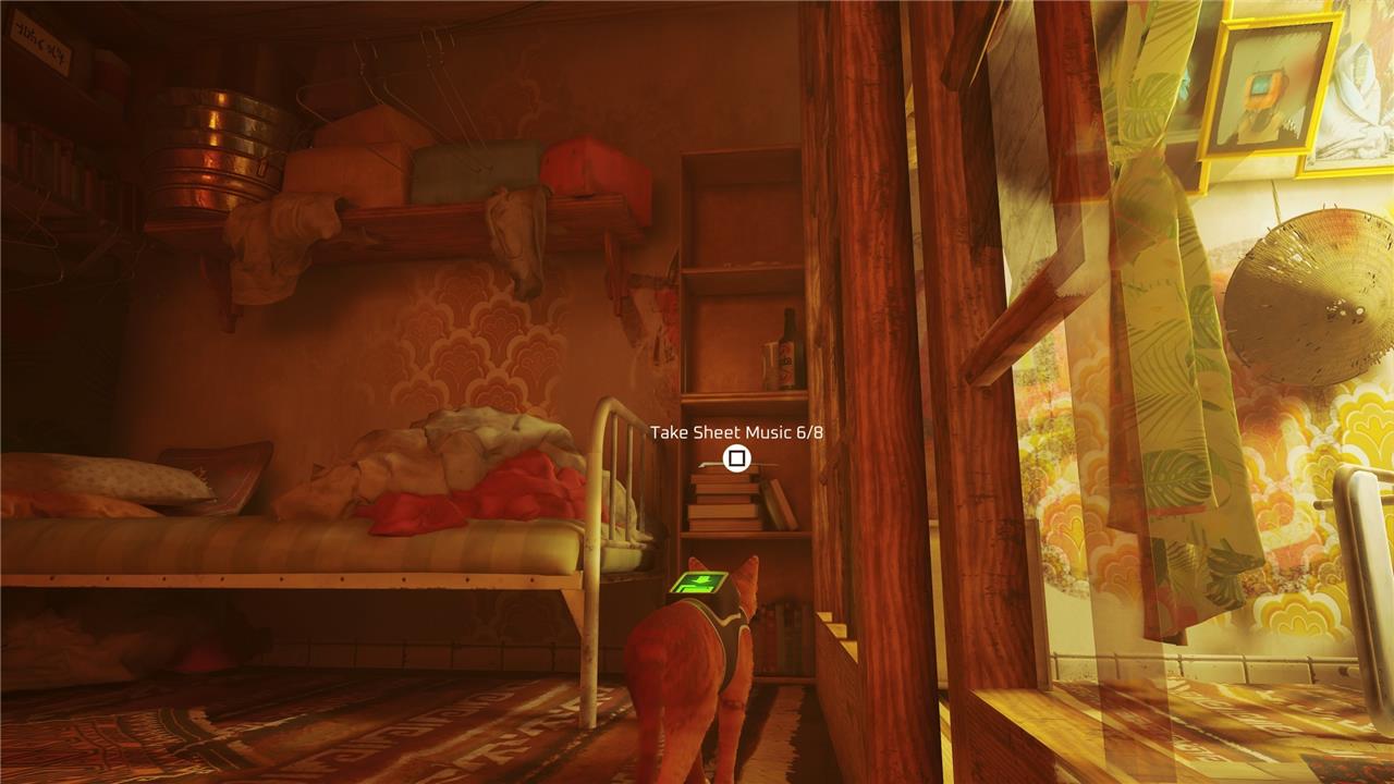Work your way onto the rooftops and follow B12’s instructions until you’ve made your way inside of Momo’s apartment. Talk to the robot and then look for the storage room/bathroom combo around the corner. (You’ll need to walk through the door’s bars, but you’ll know you’re in the right room because it has a toilet and is filled with boxes). Climb up to the top shelf and you’ll find the Sheet Music 1/8 waiting for you.