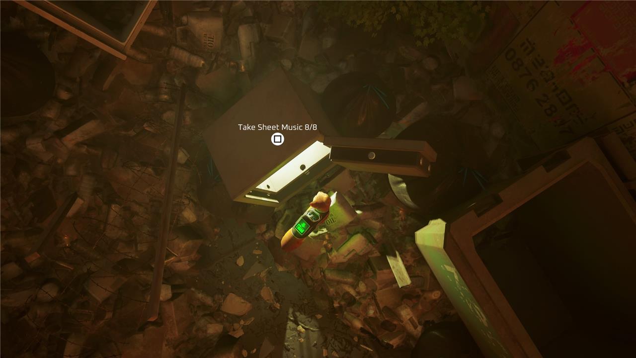 After speaking to the robot near the bucket ride, enter Momo’s apartment building and turn left past the tape player into the storage room with a toilet. Squeeze through the barred door amid the boxes, then jump onto the upper shelf to pick up Sheet Music 1.