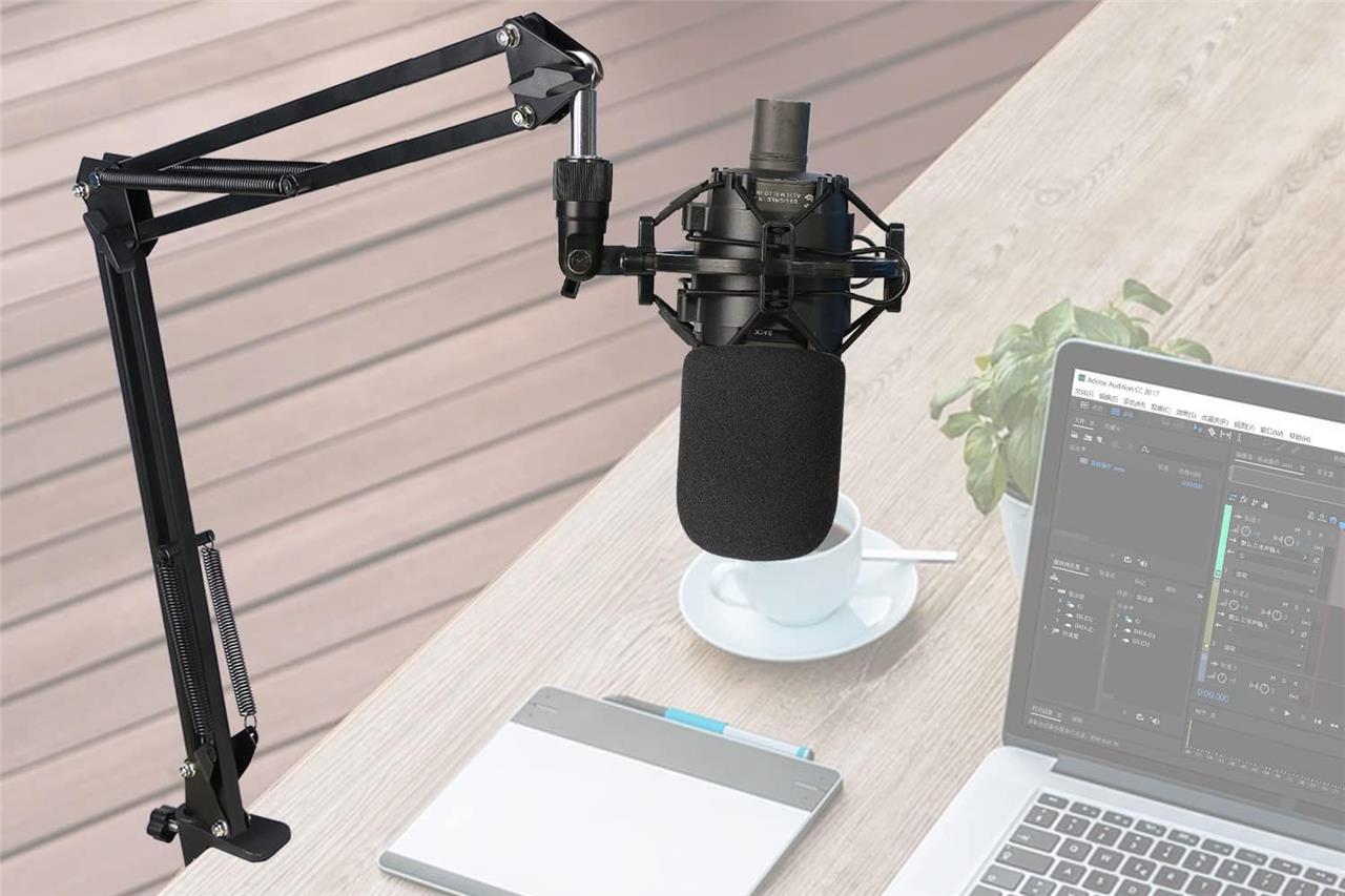 The Audio-Technica AT2020 mic boom arm comes with a foam windscreen that works like a standard pop filter (reducing the “pop” sound made from uttering plosives, as well as protecting it from saliva) for $19.49. That way, you don’t need to buy an additional attachment to lessen undesired noises. It’s guaranteed to match the Audio-Technica AT2020 microphone we recommend above.