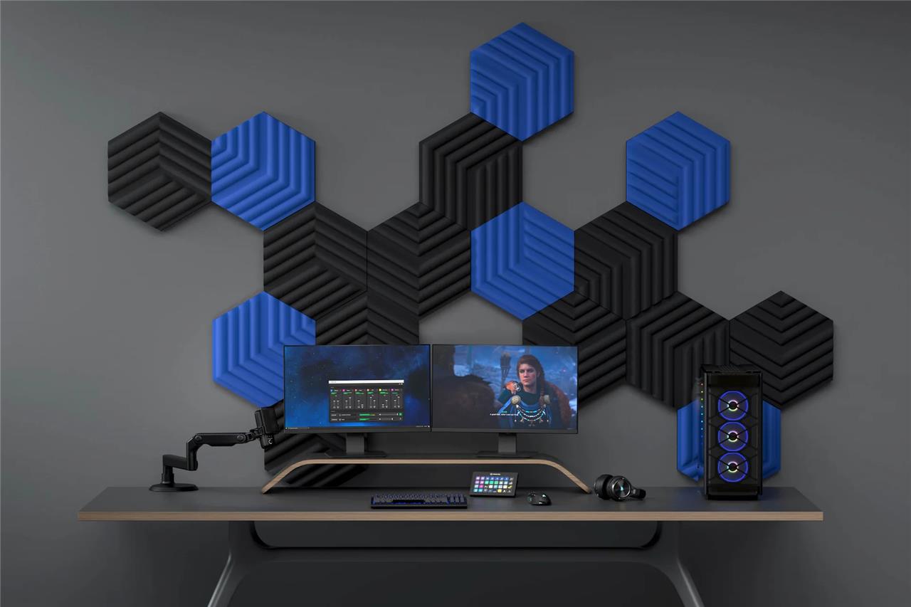 The Elgato Wave Panels Starter Set is an excellent addition to any streaming setup, designed to transform your space into a professional acoustic environment. Featuring dual-density foam construction, these hexagonal panels effectively reduce room echo and reverberation by dampening high frequencies and absorbing mids and lows. The modular design with EasyClick Frames allows for limitless customization, enabling you to create unique shapes and configurations that suit your space and style. Installation is quick and hassle-free, using lightweight panels that can be mounted with supplied adhesive strips or screws, making them easy to relocate without damage. With the Wave Panels, your vocals become clearer and more detailed, enhancing the overall sound quality of your streams and recordings.