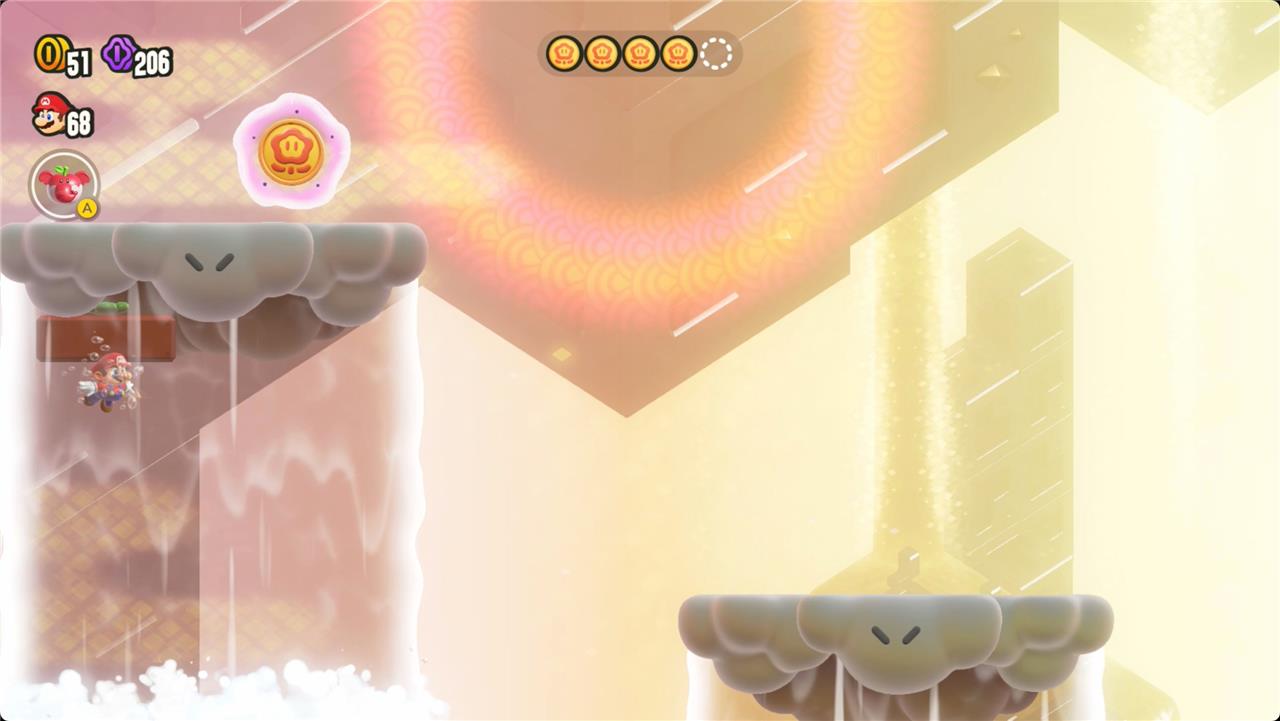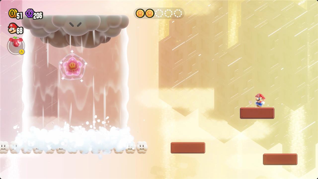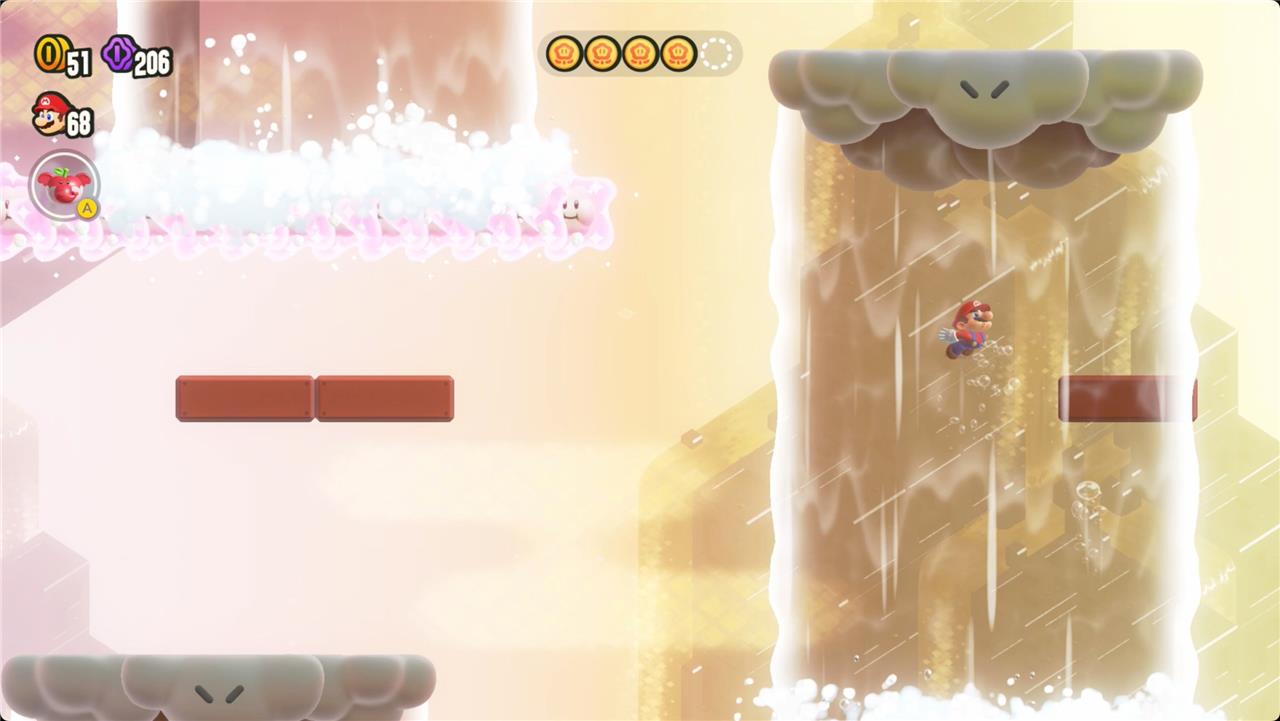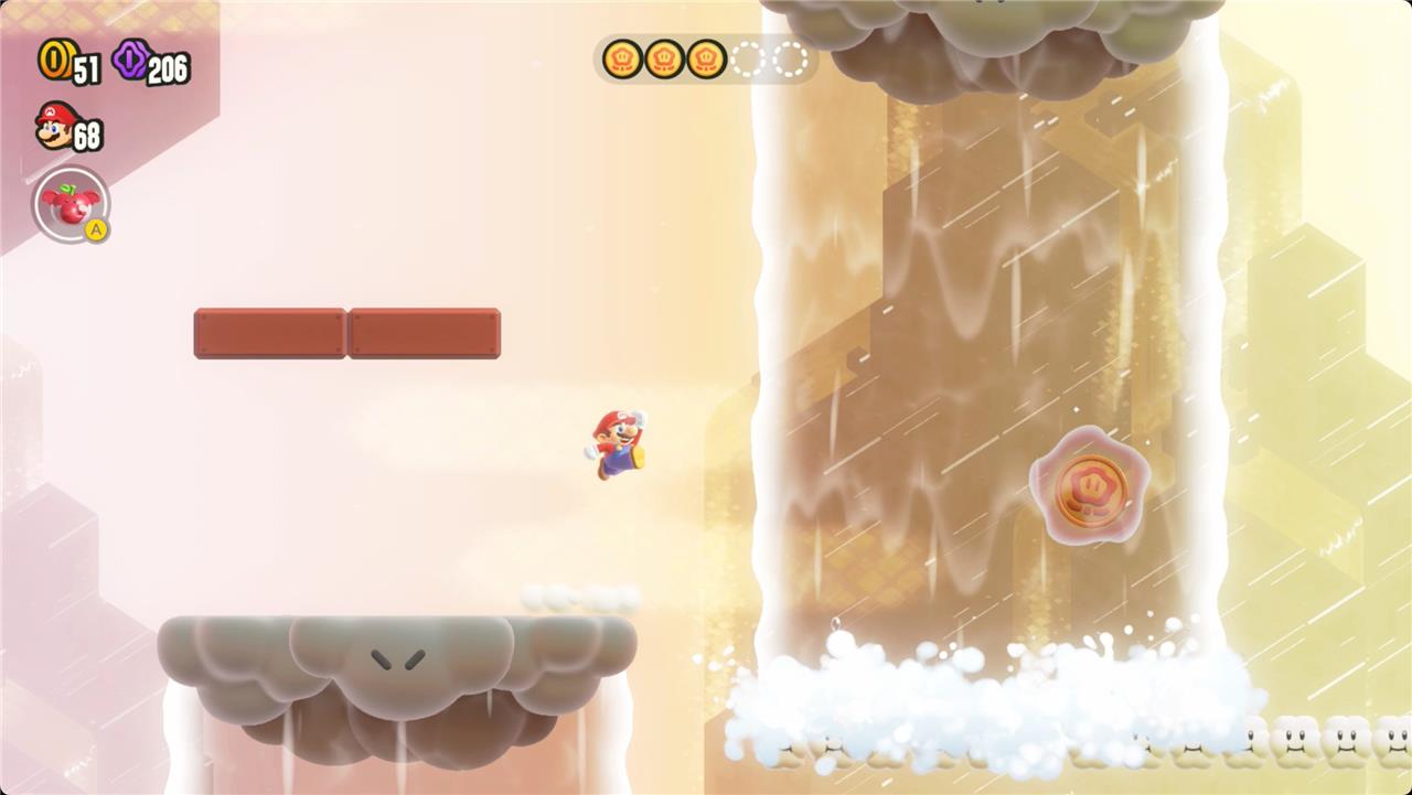 Search Party: An Empty Park? challenges players to find five well-hidden Wonder Tokens in a seemingly empty room within World 3’s Shining Falls. Each token is concealed behind invisible blocks, requiring players to jump and explore every corner. The first token appears by jumping near the entrance, just left of a broken pillar, where hidden blocks form a path upward. The second token is revealed by jumping right above the first token’s spot, again using hidden blocks to reach it. For the third token, players must trigger hidden moving platforms by jumping on the left side of the area, then ride and explore these platforms, revealing a waterfall and the token within. The fourth token is found by swimming up the waterfall, jumping onto a cloud, and hitting two more hidden blocks to reveal another downpour and the token. Finally, the fifth token is uncovered by hitting a hidden block near the midpoint of the last waterfall, then another at the top-left to make the final token appear on a cloud. Collecting all five Wonder Tokens will spawn the Wonder Seed and complete the level.