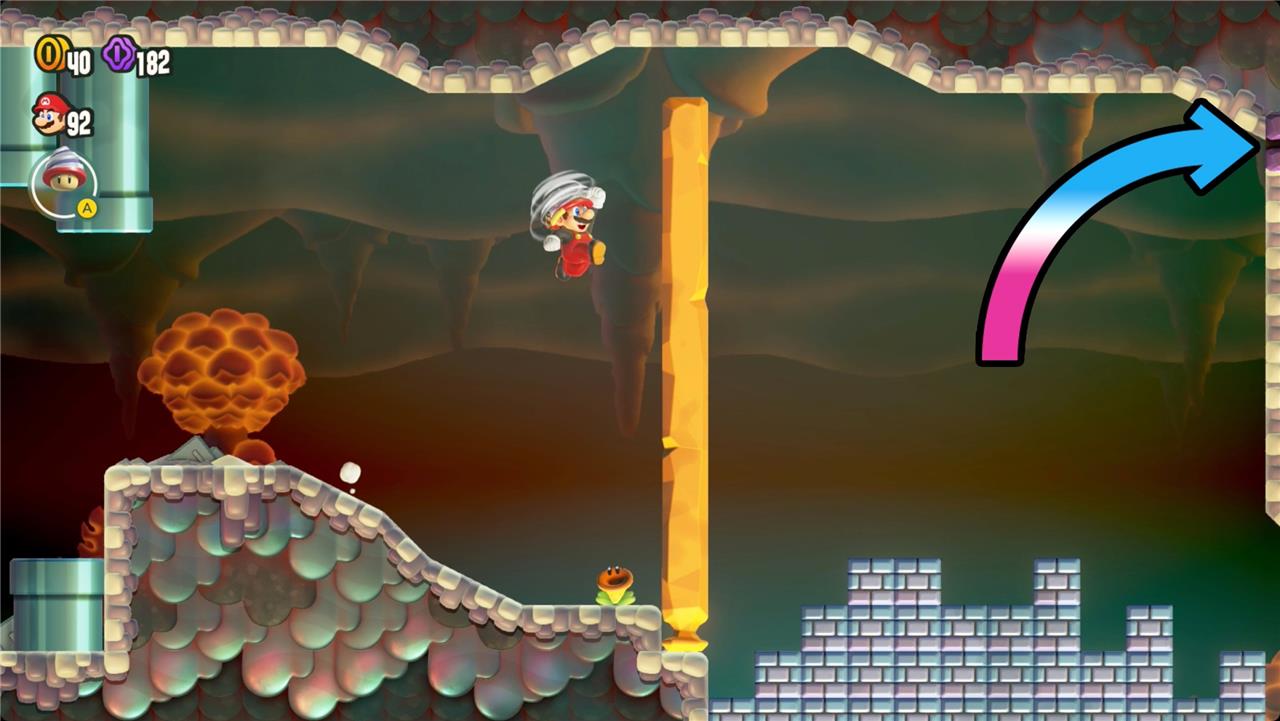 The first Wonder Seed you can find is actually the secret one. You need to be Drill Mario (or whoever you’re playing as) when you reach the tall pillar just before the checkpoint. Jump against the pillar to knock it over and Wall Jump up into the ceiling. Continue through the narrow gap to the upper right.