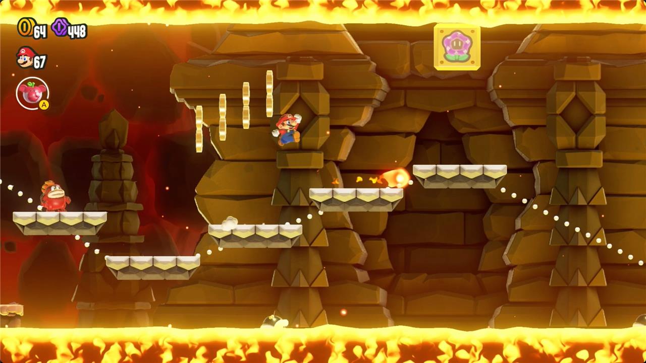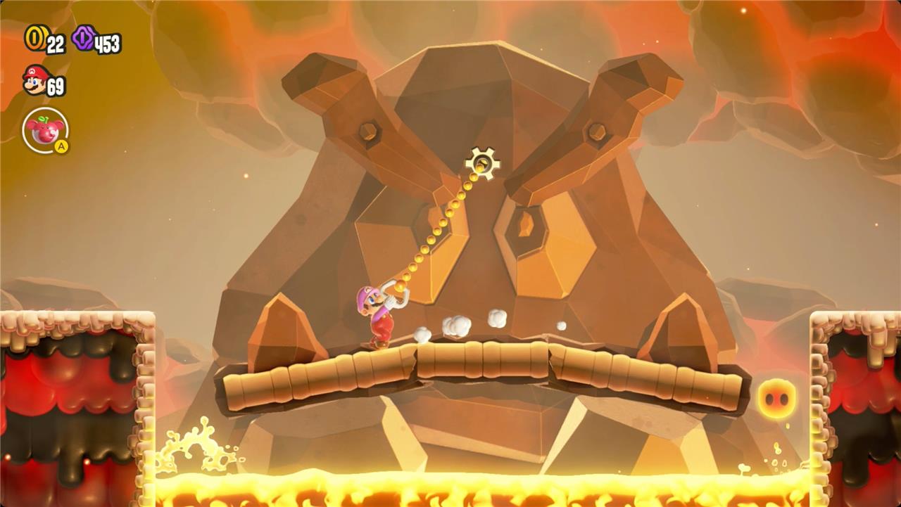 The rotating dragon bones in Deep Magma Bog hide several intriguing secrets. By performing a ground pound on a glowing spot on a stationary dragon fossil, you can reveal a Wonder Flower that brings the dragon fossil back to life, allowing you to ride the flying dragon as it loops through the level. Additionally, the rotating dragon bones serve as platforms to ascend and reach hidden Wonder Seeds located at the top of the area. These fossils also conceal multiple large purple 10-Coin Flower Coins that appear on or around the moving dragon bones, requiring precise timing to collect. Riding and jumping on these rotating dragon fossils is key to uncovering these hidden rewards and progressing through the level’s secret paths.