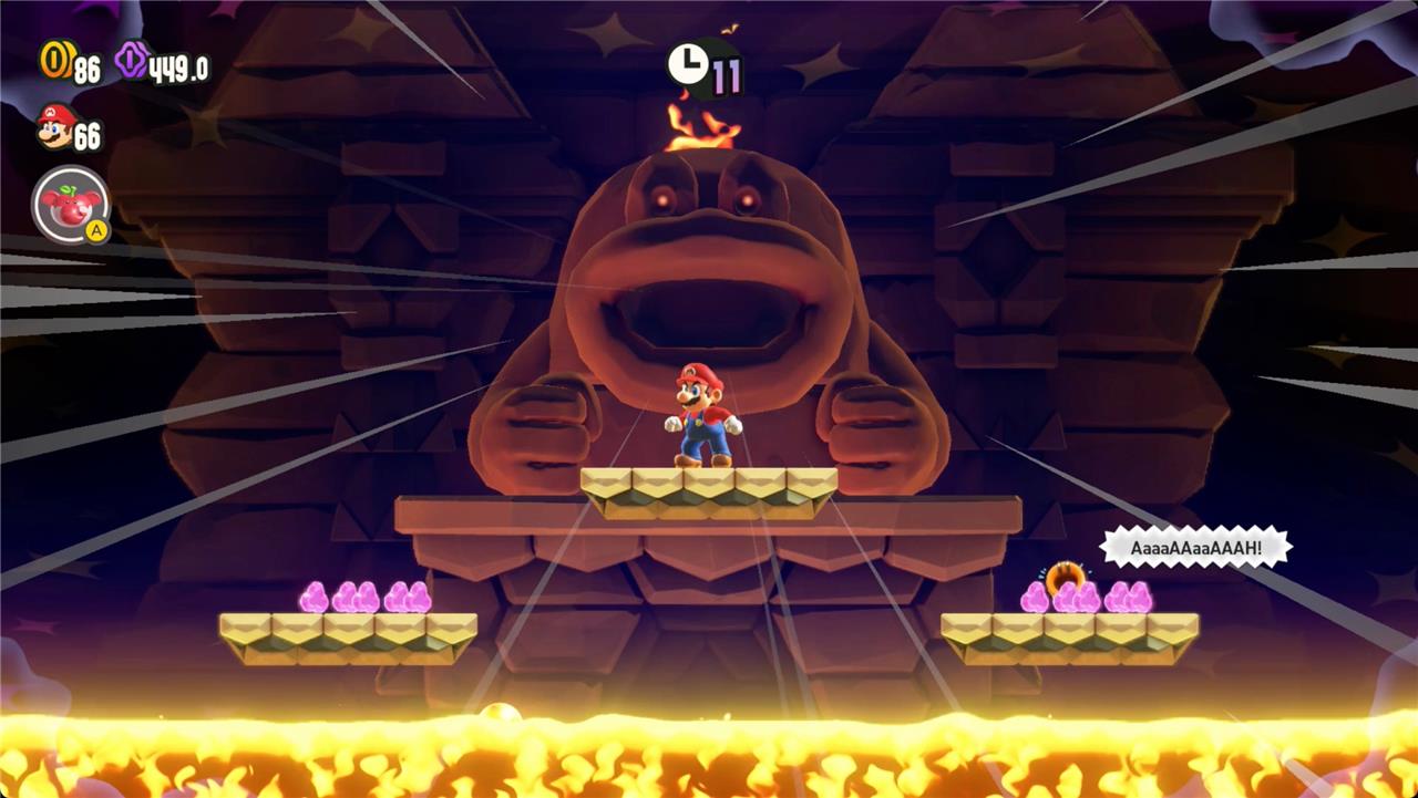A little past the checkpoint, you’ll pass over the mouth of a giant Goomba statue. Grab the cord, pull it to make the Goomba sad, and the Wonder Flower will appear.