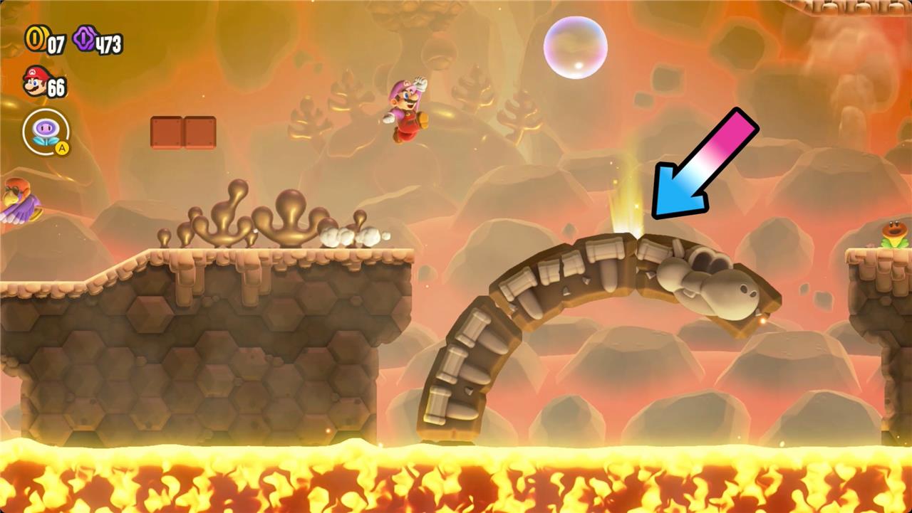 Right after the level’s second checkpoint, you’ll come to a Dragon skeleton with a glowing spot on top. Ground Pound it to reveal the Wonder Flower.