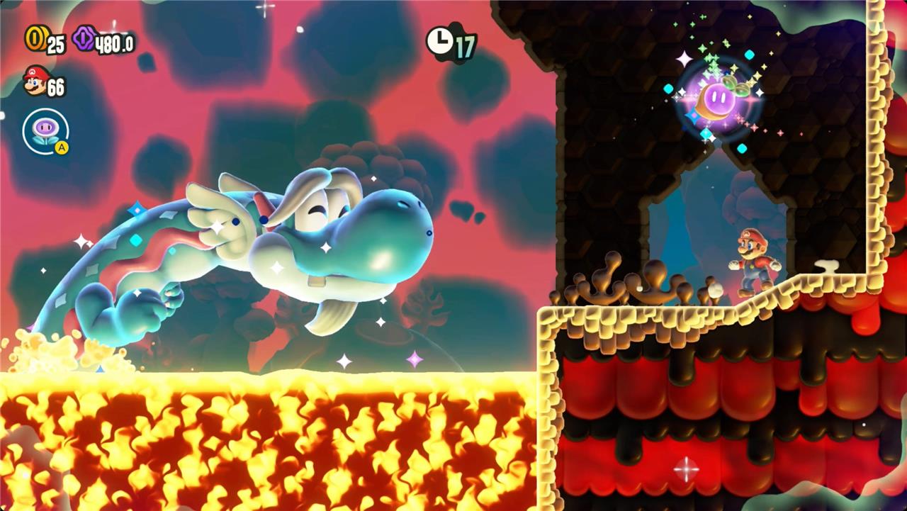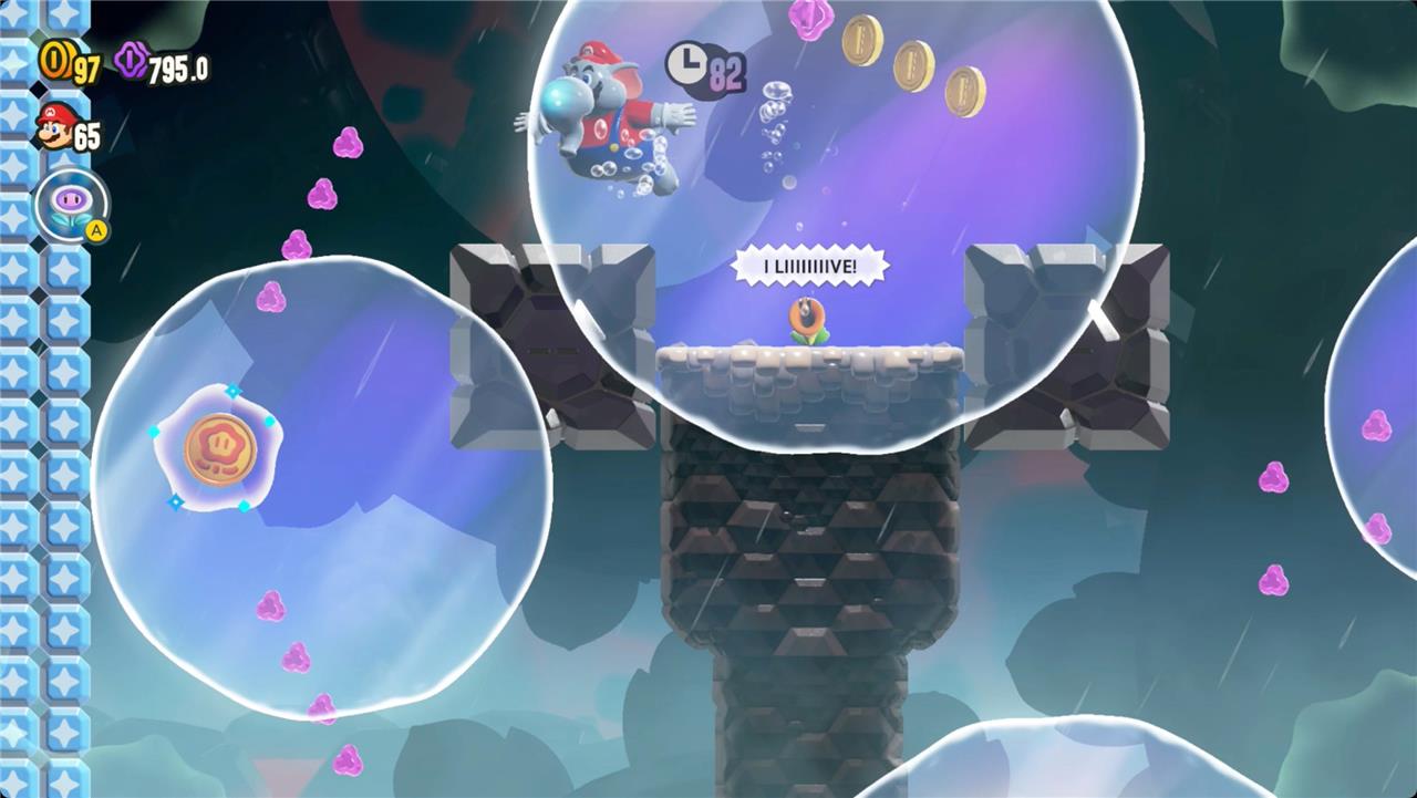 Most levels will have a Wonder Flower to collect. This special flower triggers a trippy reframing of the current level – sometimes the gravity disappears or you enter a twilight realm or multihued bubbles will carry you into the sky. Many of the Wonder Flower sequences end with a Wonder Seed.