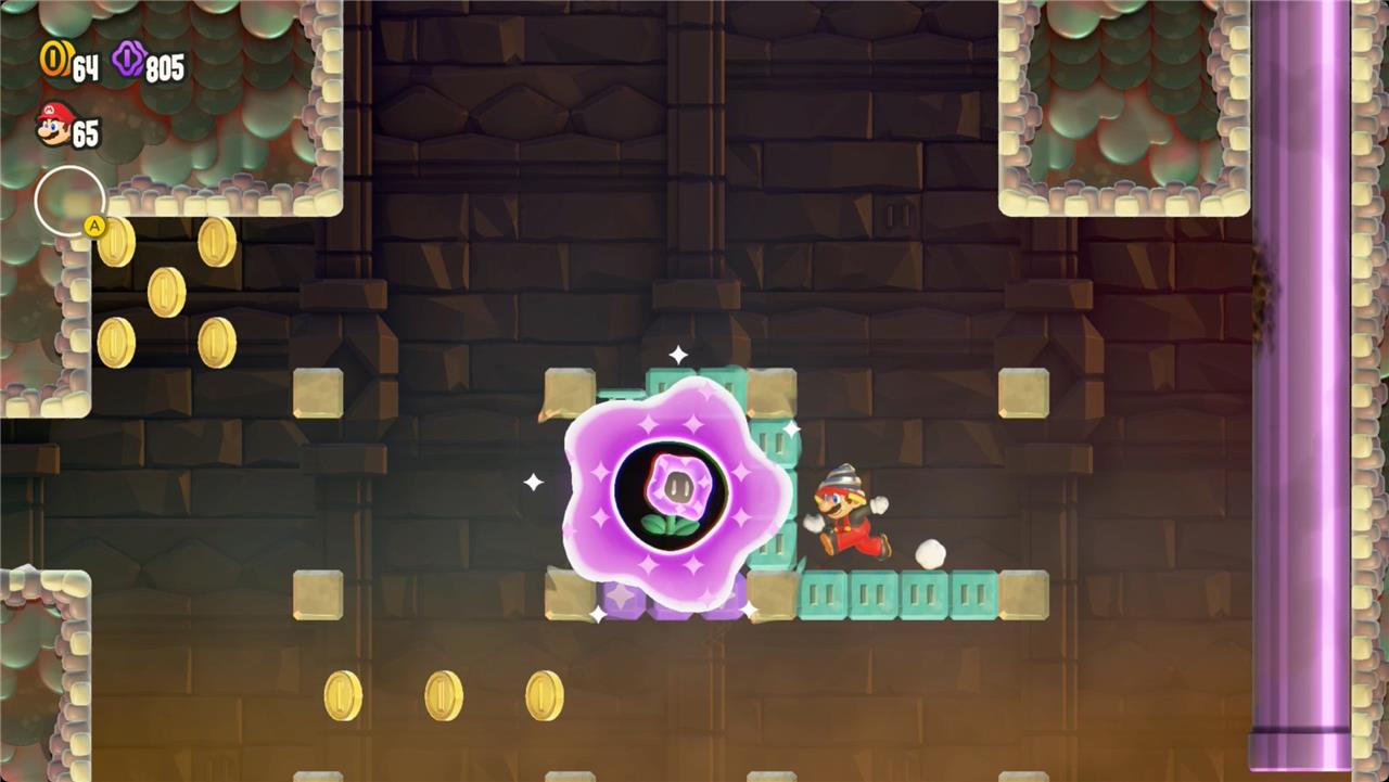 Start the level again and continue through to the checkpoint (below where you got the first Wonder Seed). A little farther along, a Rrrumba with a purple glow will appear above you. Destroy it – either with a Spiny shell, by smashing it into another Rrrumba, or by Drilling into the ground and coming up beneath it – to reveal the Wonder Flower.