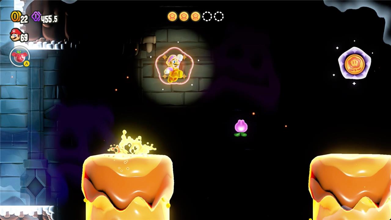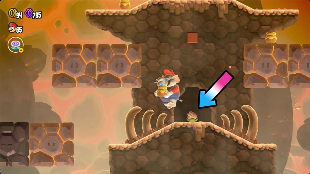 To find the third, hidden Wonder Seed, you’ll need to play the level again with the Boosting Spin Jump Badge (there might be another way to reach it, but this was the easiest we’ve found). When you reach the checkpoint, turn around and backtrack to the Hot-Hots just to the left.
