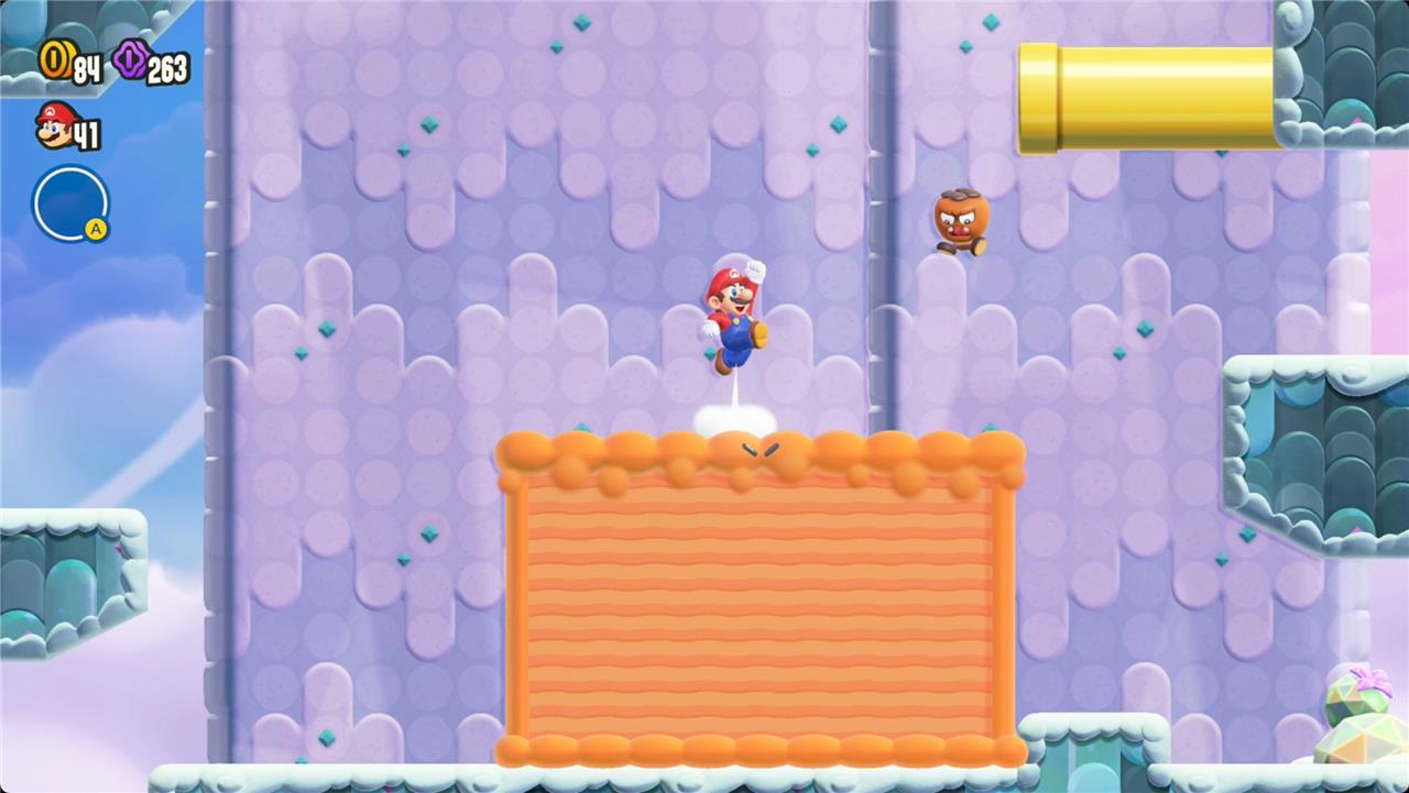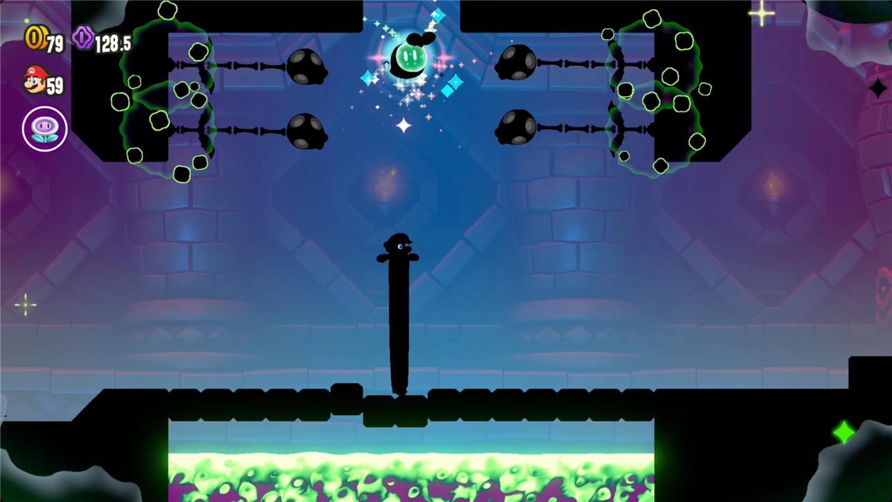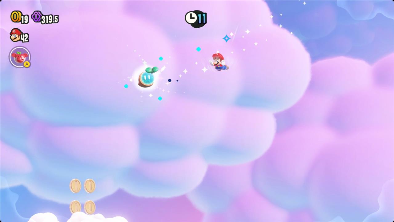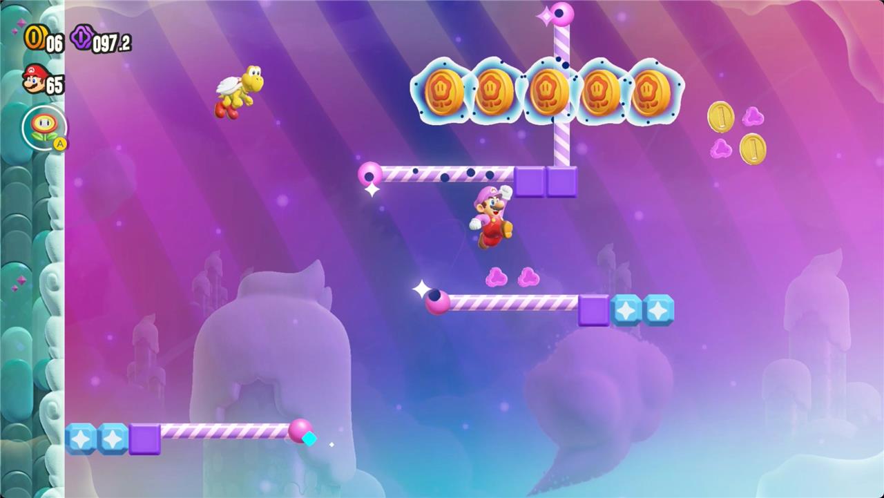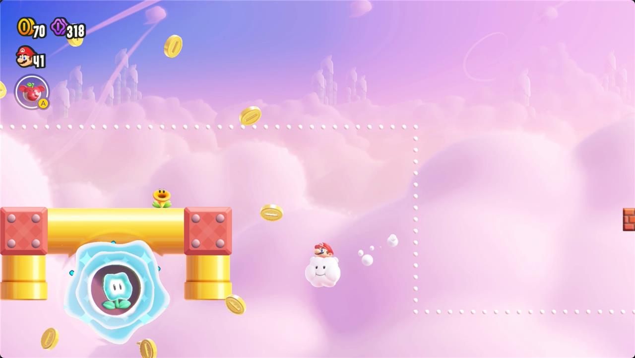 Most levels will have a Wonder Flower to collect. This special flower triggers a trippy reframing of the current level – sometimes the gravity disappears or you enter a twilight realm or multihued bubbles will carry you into the sky. Many of the Wonder Flower sequences end with a Wonder Seed.