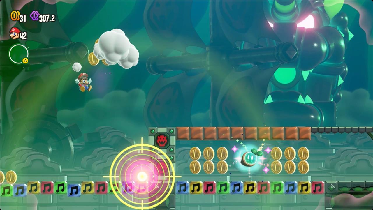 This level’s Wonder Flower sequence has you getting targeted by a distant gun. When you see the Wonder Seed, bait the targeting reticle into destroying the blocks so you can collect it.