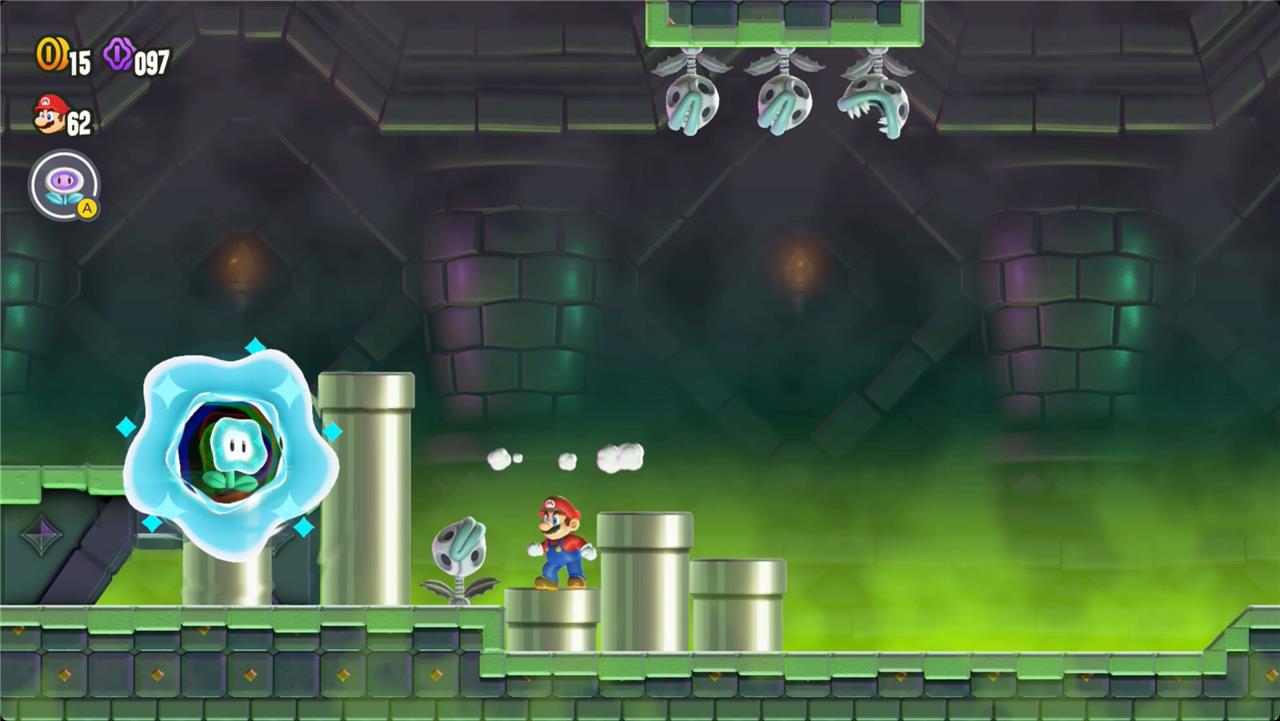 A little past the checkpoint, you’ll come to a pair of pipes spitting fireballs separated by a platform. Hit the blue flower to reveal the Wonder Flower, but it’ll show up under the platform.