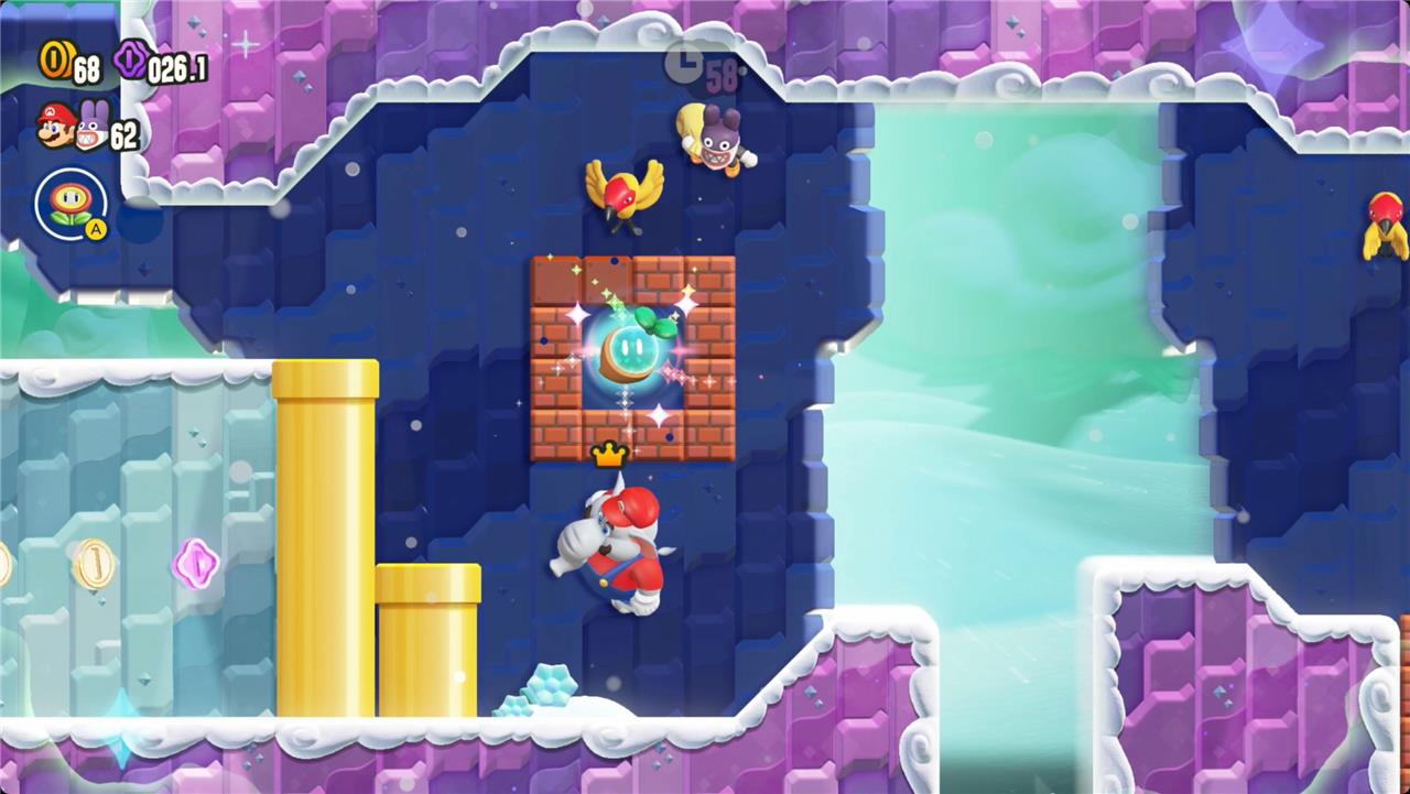 After the Checkpoint Flag, progress through the level without collecting the Wonder Flower hidden inside a giant block of ice near two golden Warp Pipes.