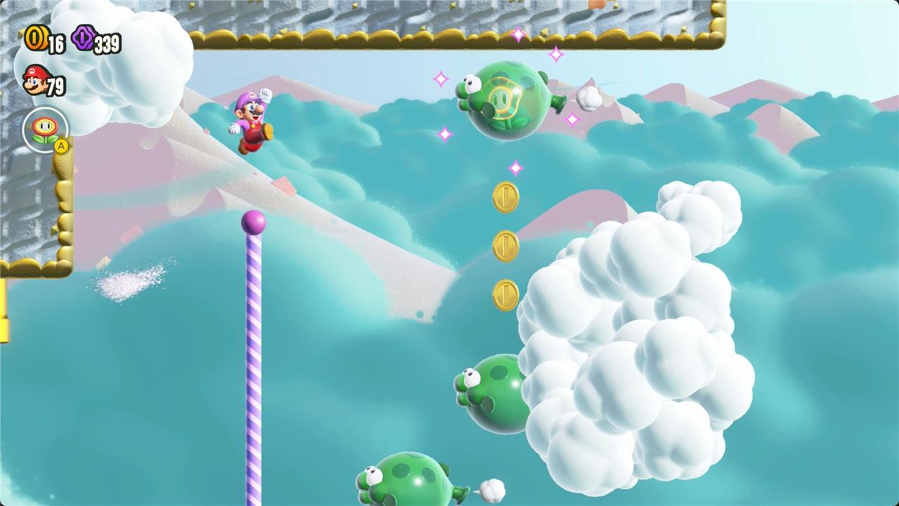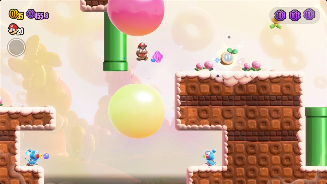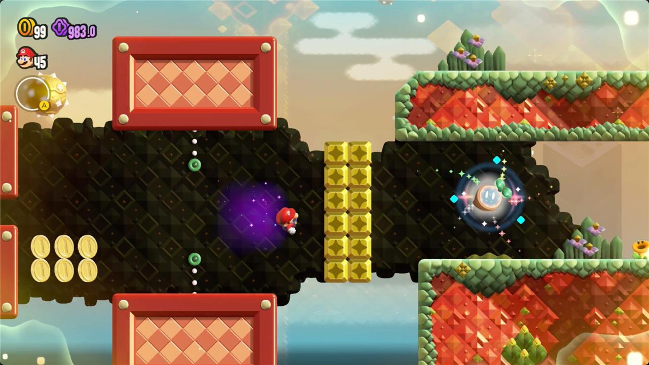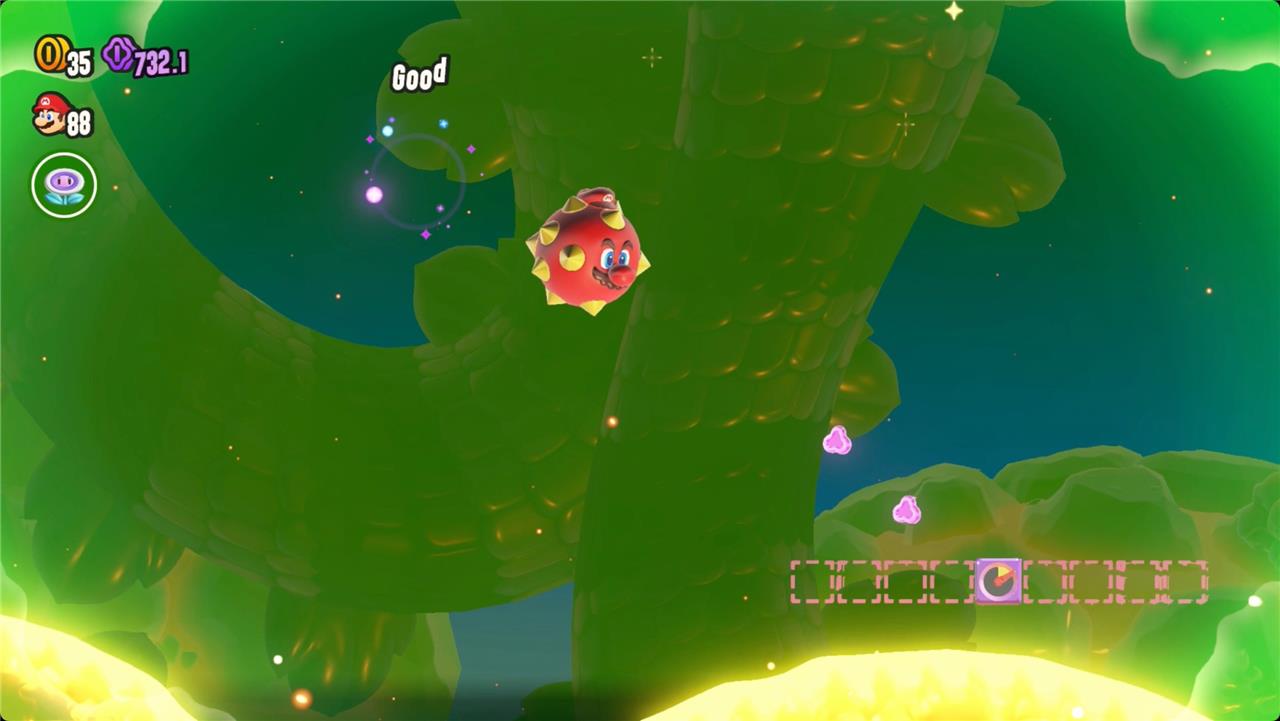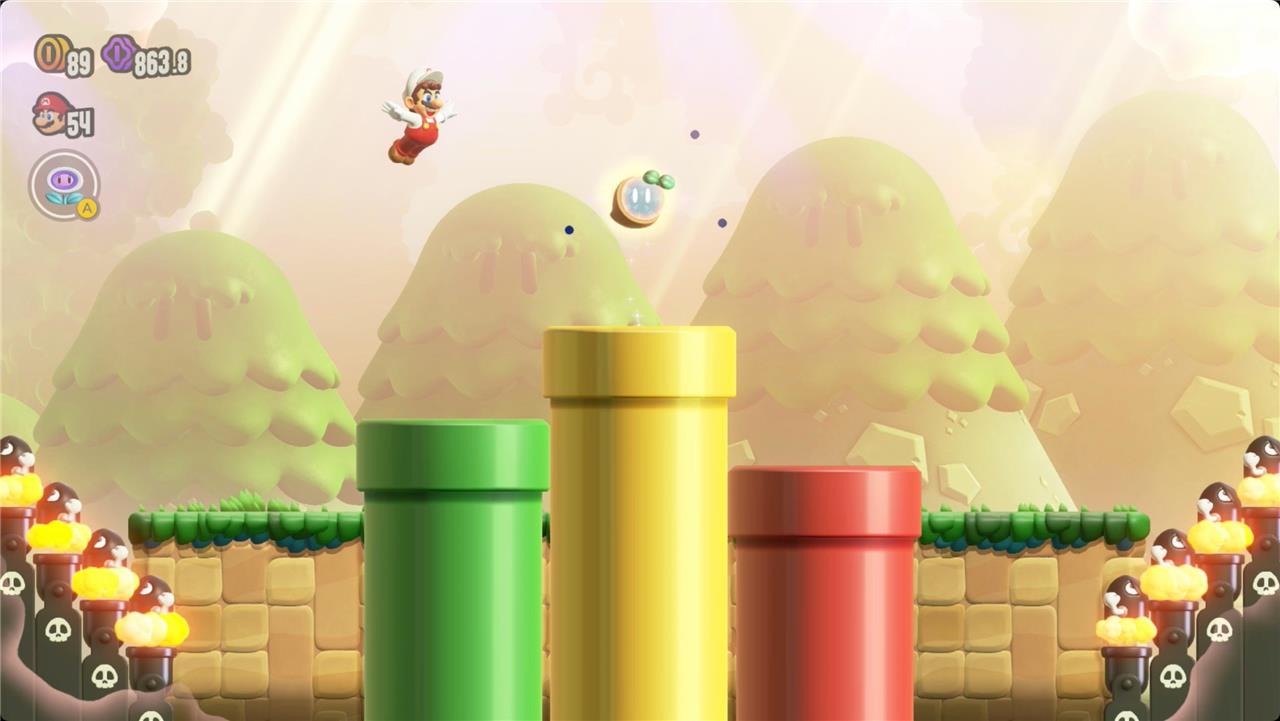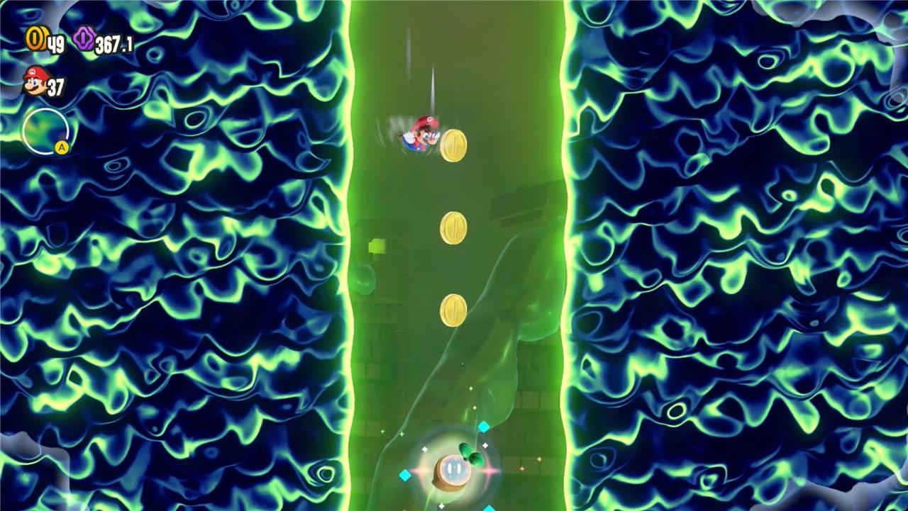 Most levels will have a Wonder Flower to collect. This special flower triggers a trippy reframing of the current level – sometimes the gravity disappears or you enter a twilight realm or multihued bubbles will carry you into the sky. Many of the Wonder Flower sequences end with a Wonder Seed.