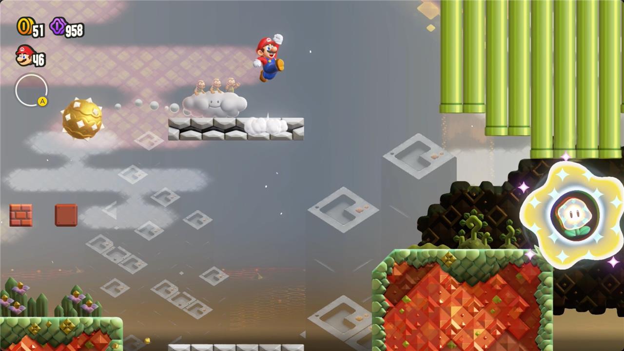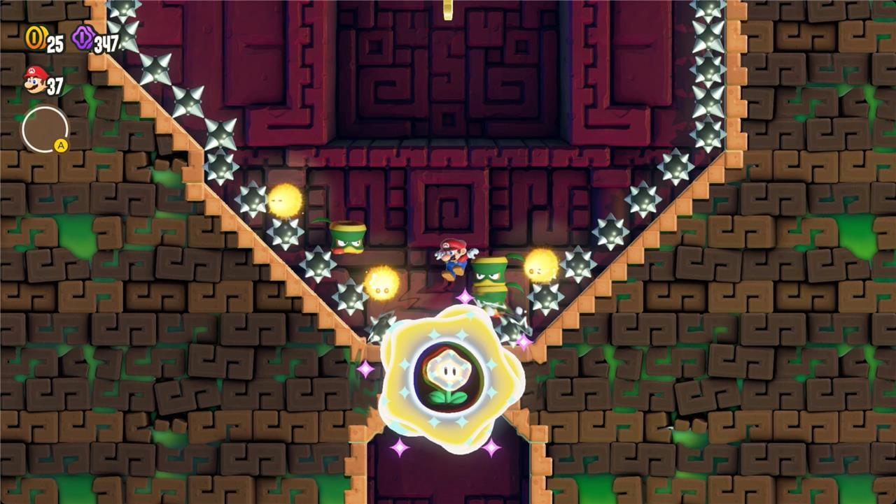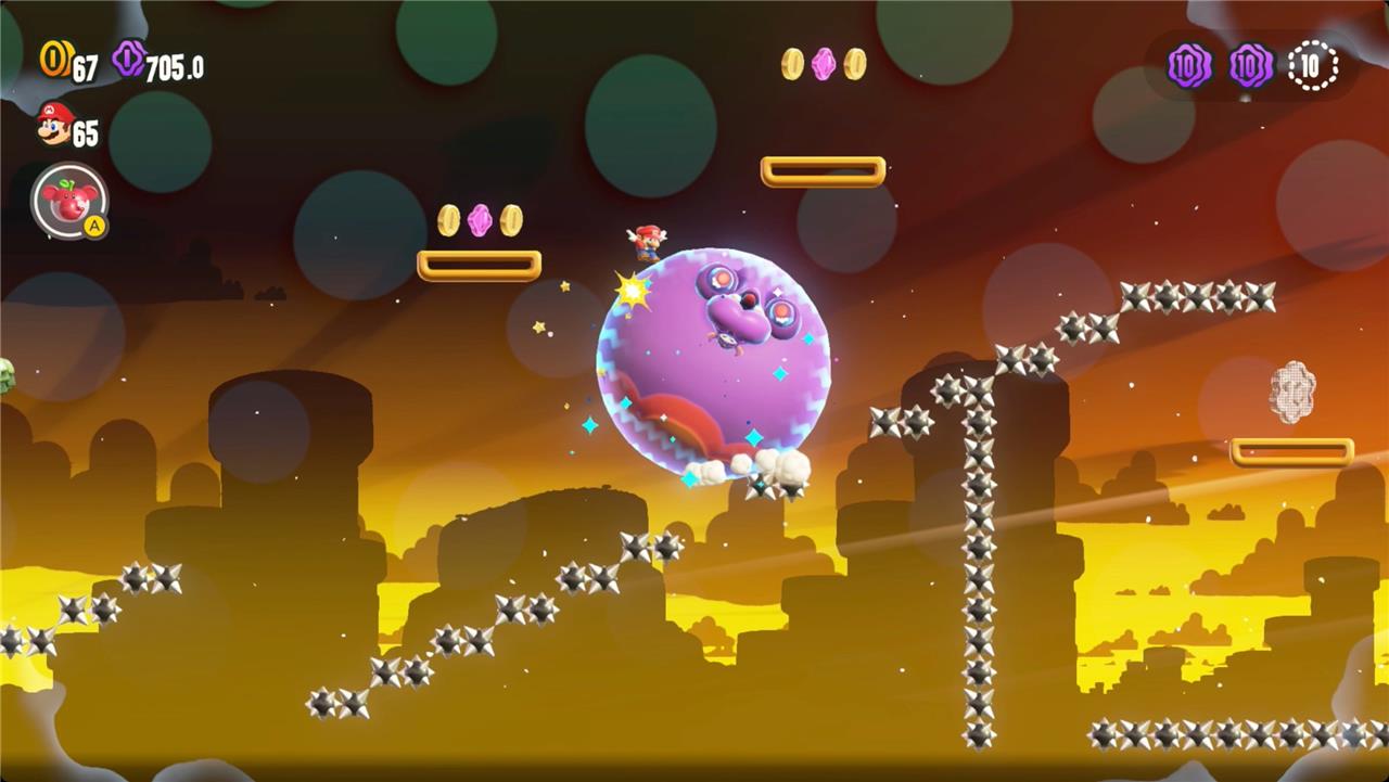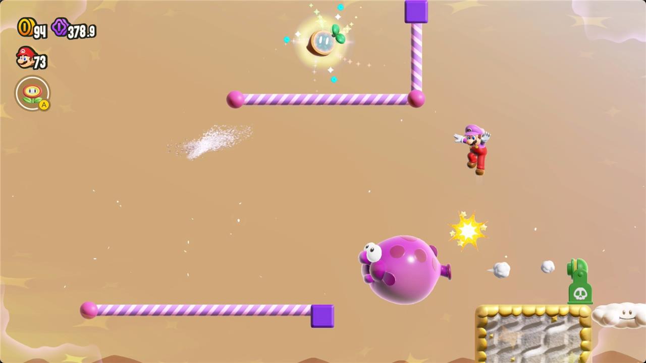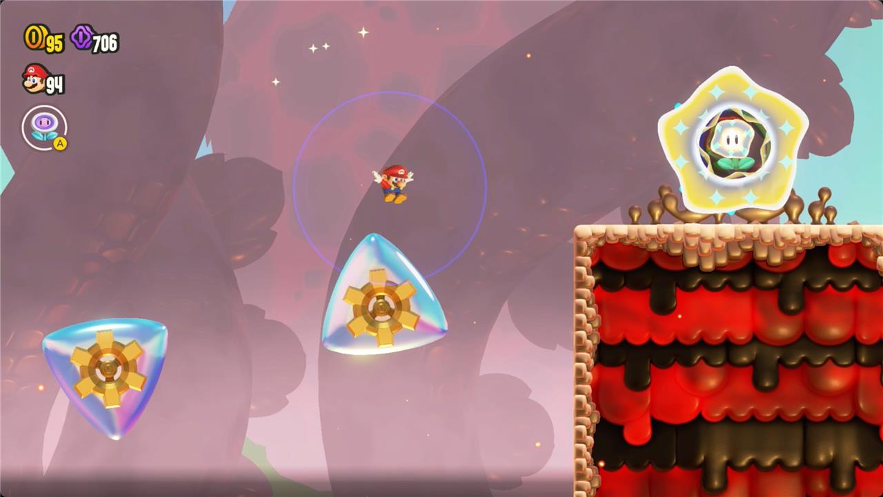 Most levels will have a Wonder Flower to collect. This special flower triggers a trippy reframing of the current level – sometimes the gravity disappears or you enter a twilight realm or multihued bubbles will carry you into the sky. Many of the Wonder Flower sequences end with a Wonder Seed.