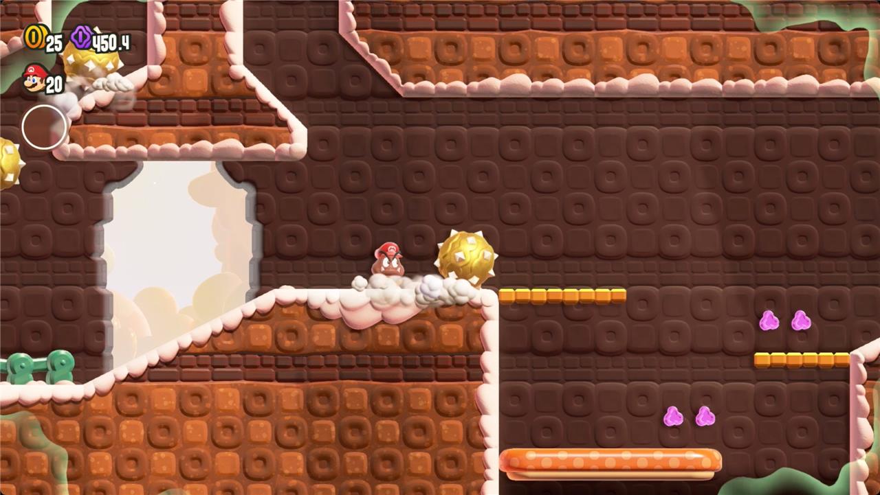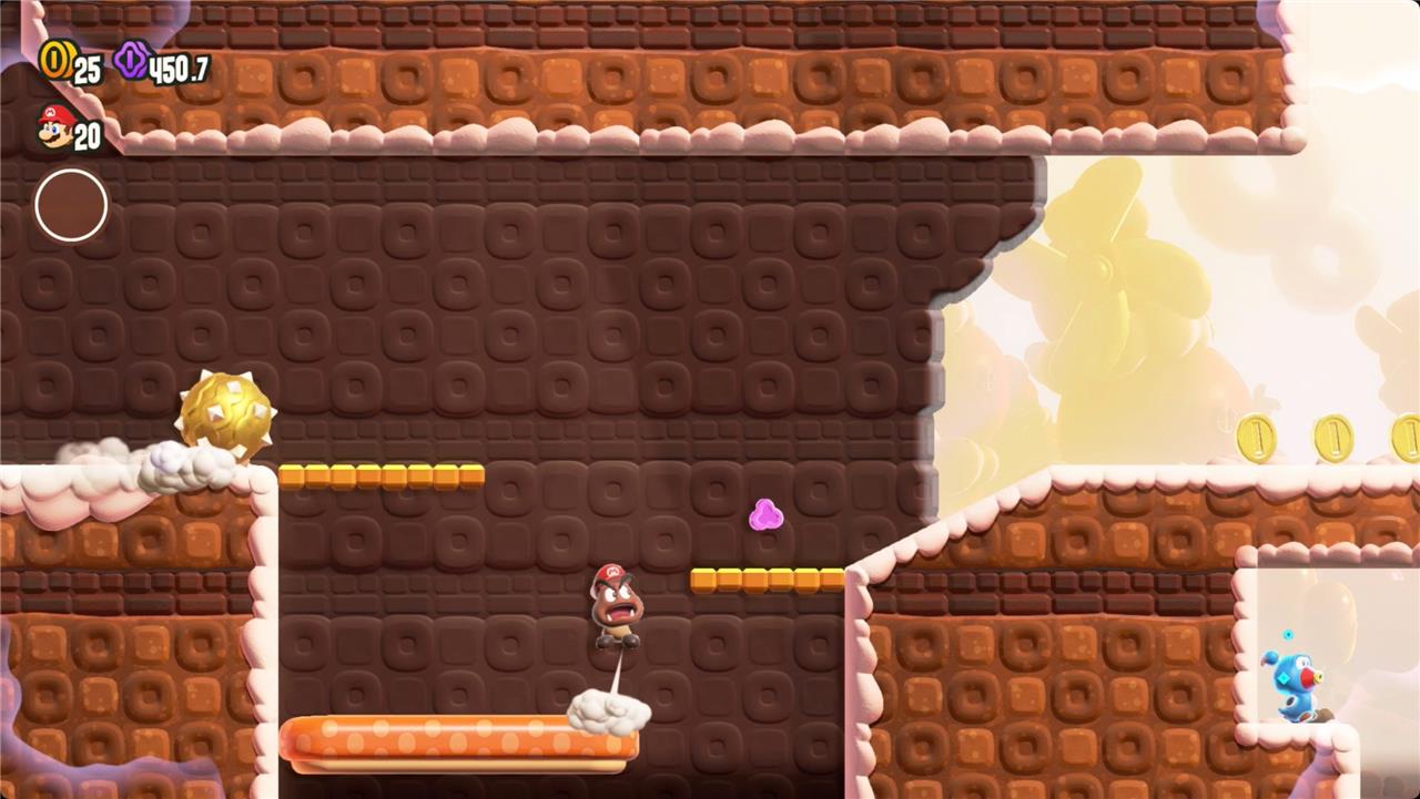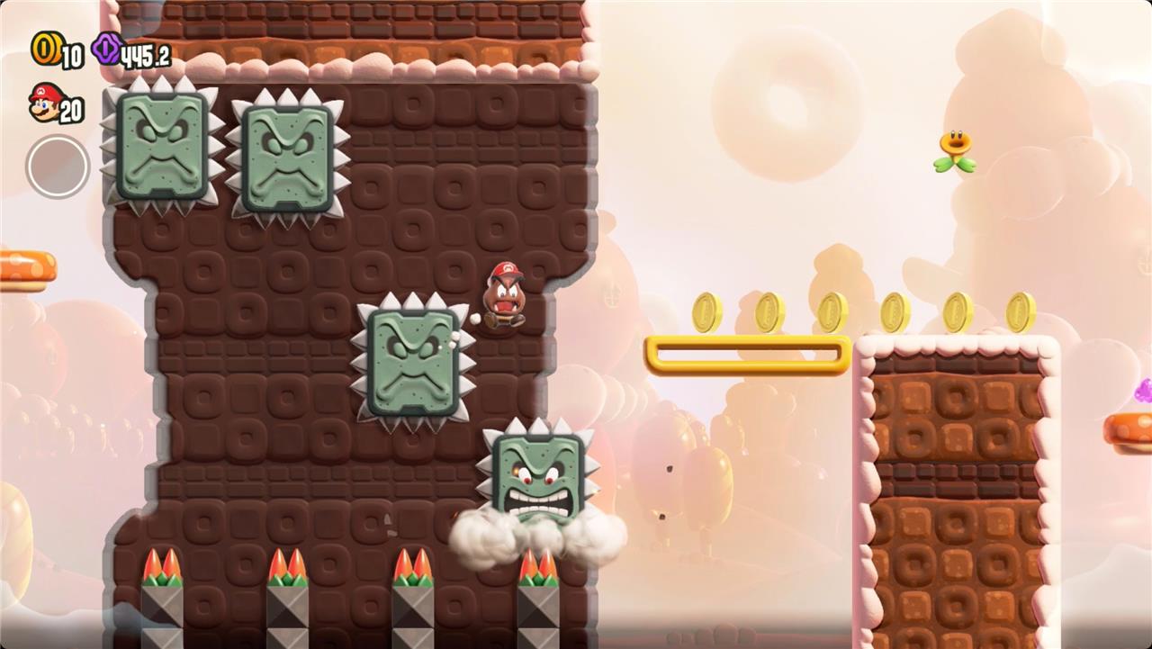 Bounce off the Goombas at the beginning of this level to reach the Wonder Flower. As Goomba Mario, you’re much slower and can’t jump, so this level is quite the challenge. You can, however, cross spikes and Thwomps without taking damage.