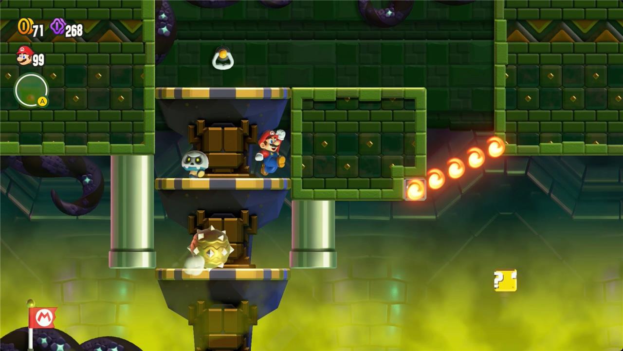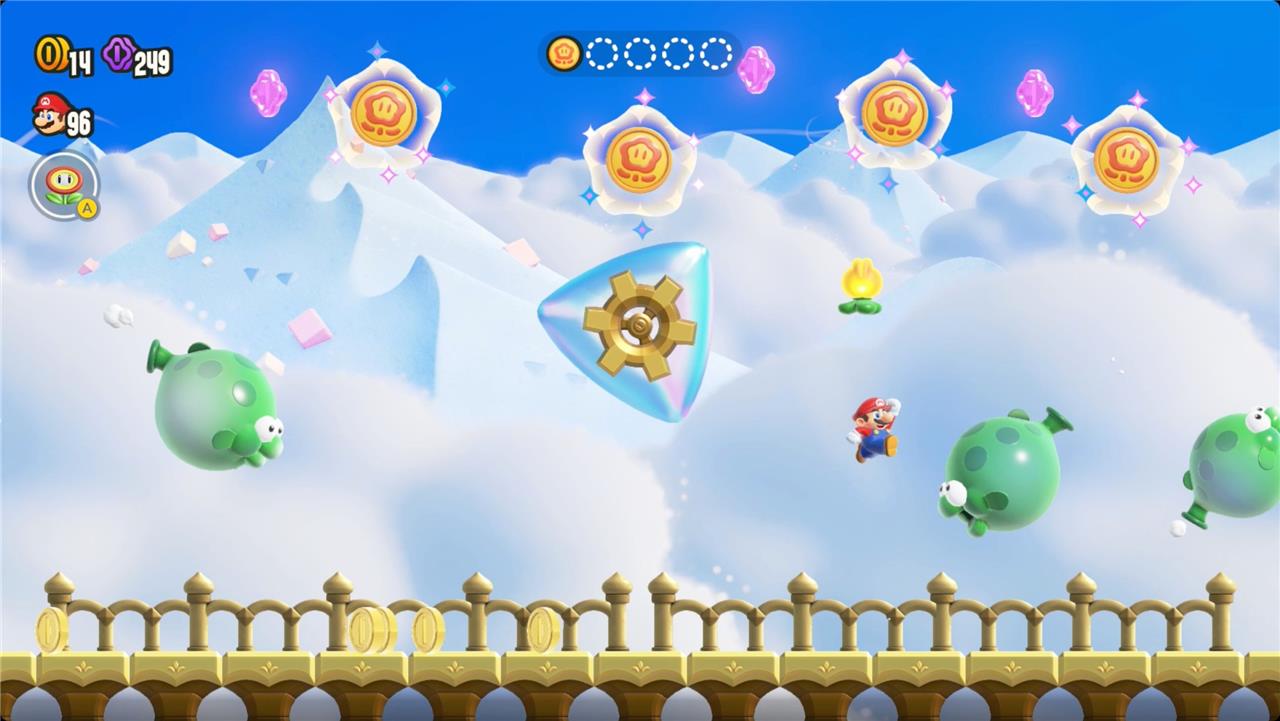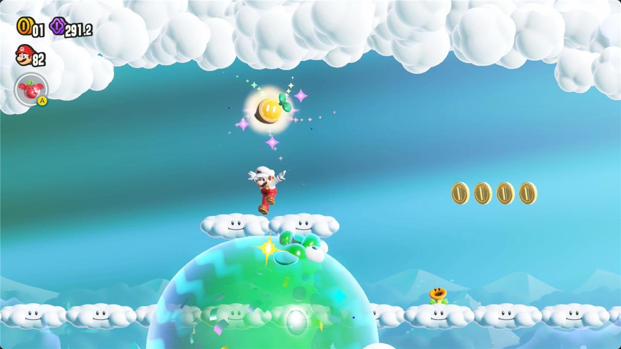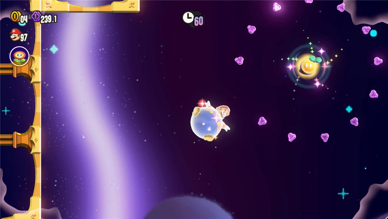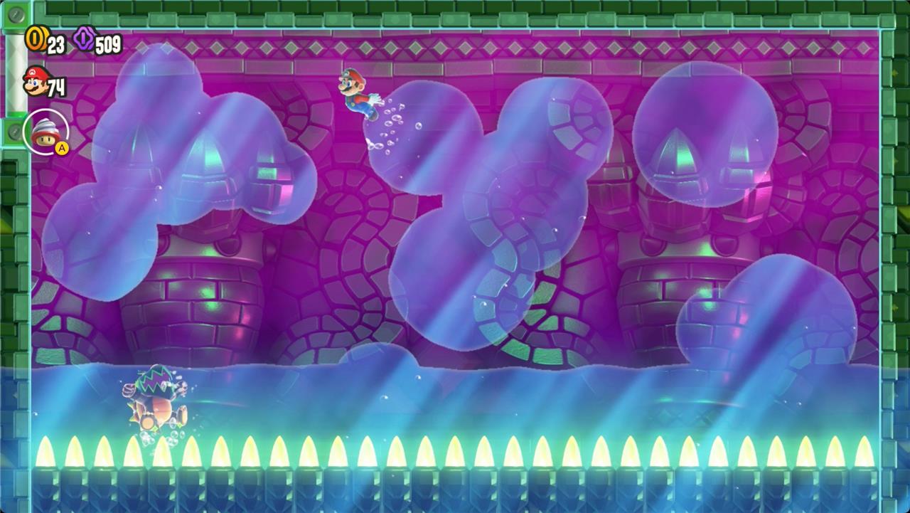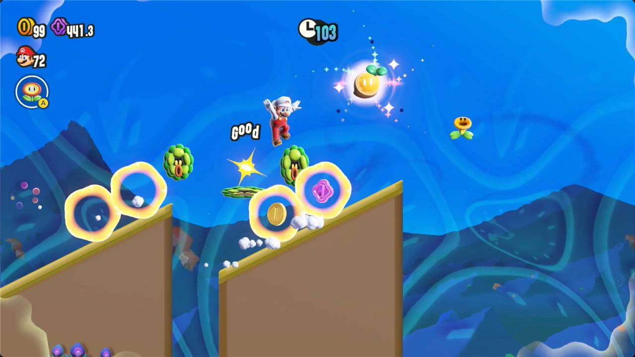 Most levels will have a Wonder Flower to collect. This special flower triggers a trippy reframing of the current level – sometimes the gravity disappears or you enter a twilight realm or multihued bubbles will carry you into the sky. Many of the Wonder Flower sequences end with a Wonder Seed.