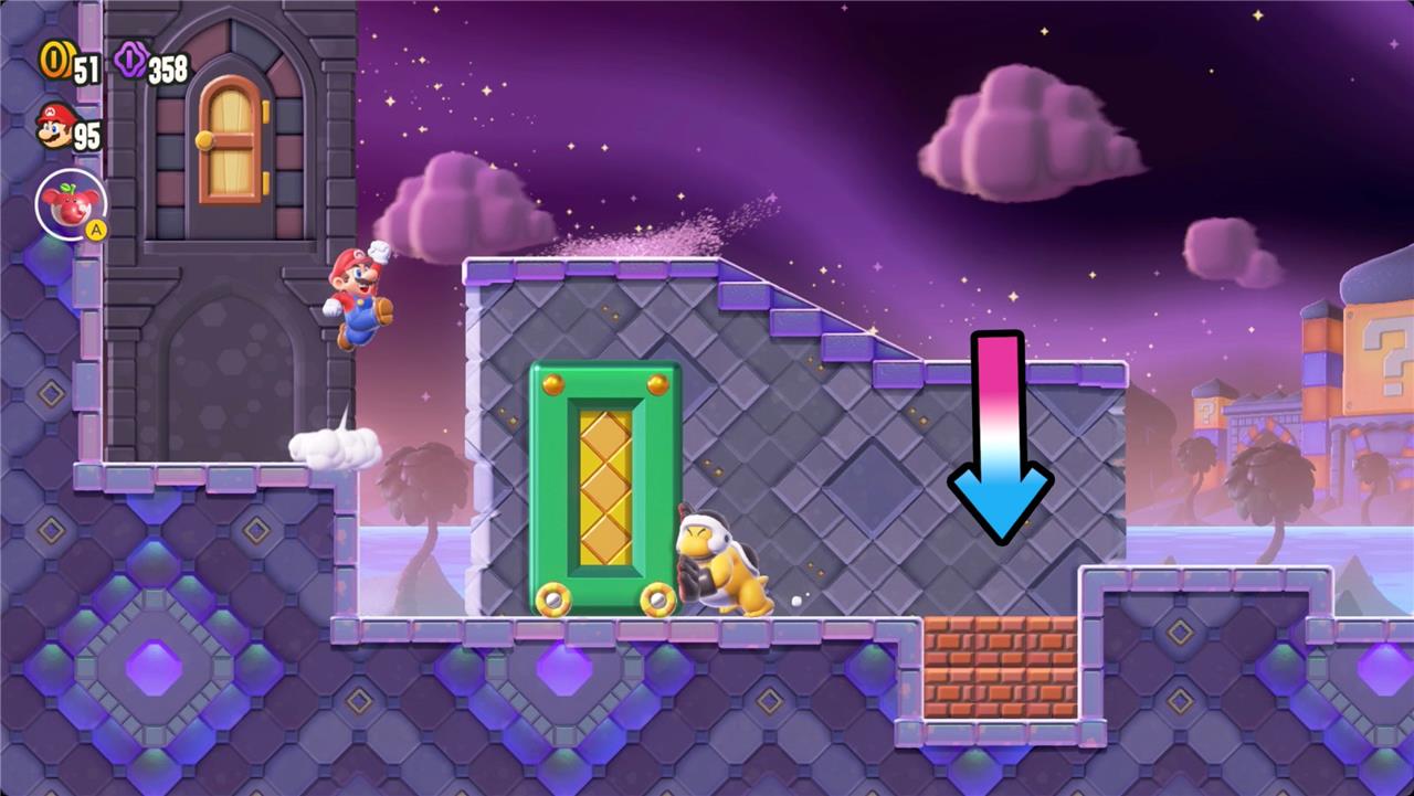 Past the level’s second checkpoint, you’ll come to a set of pillars with a pair of blocks above them. Hit the gap in between to reveal the Wonder Flower.
