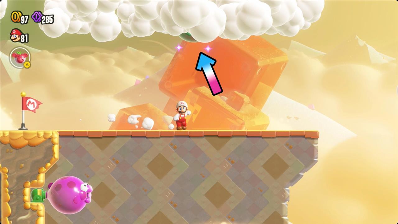 When you hit the checkpoint, watch the clouds above you for some sparkles – there’s a green Bloomp carrying the Wonder Flower. Jump to hit it and it’ll drop the flower.