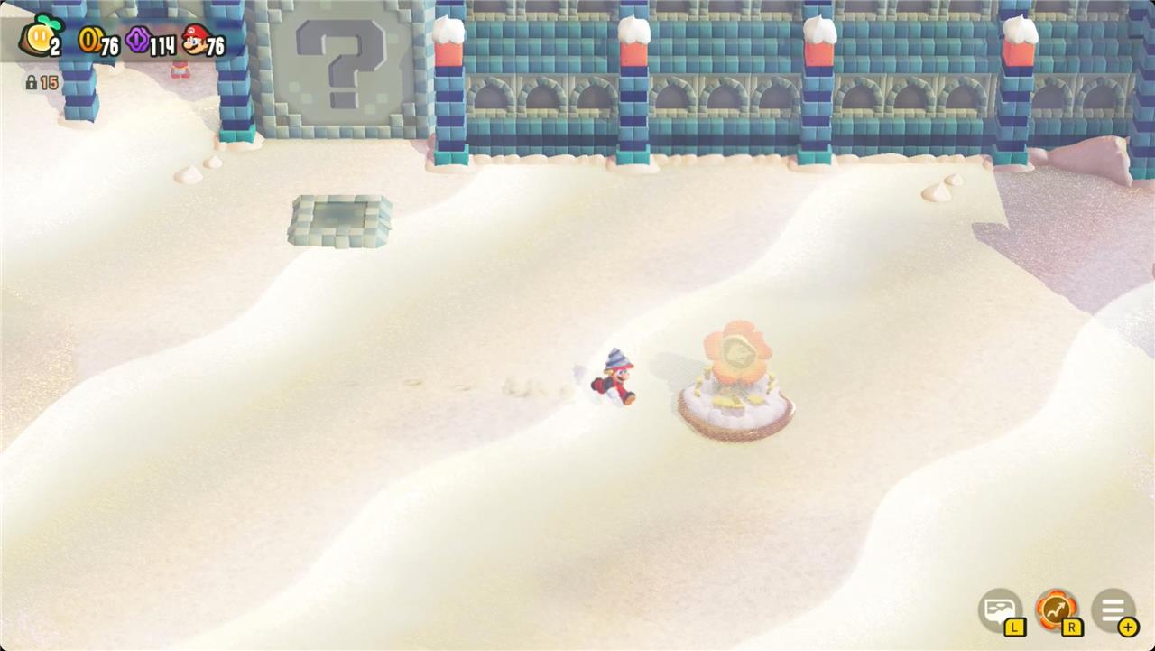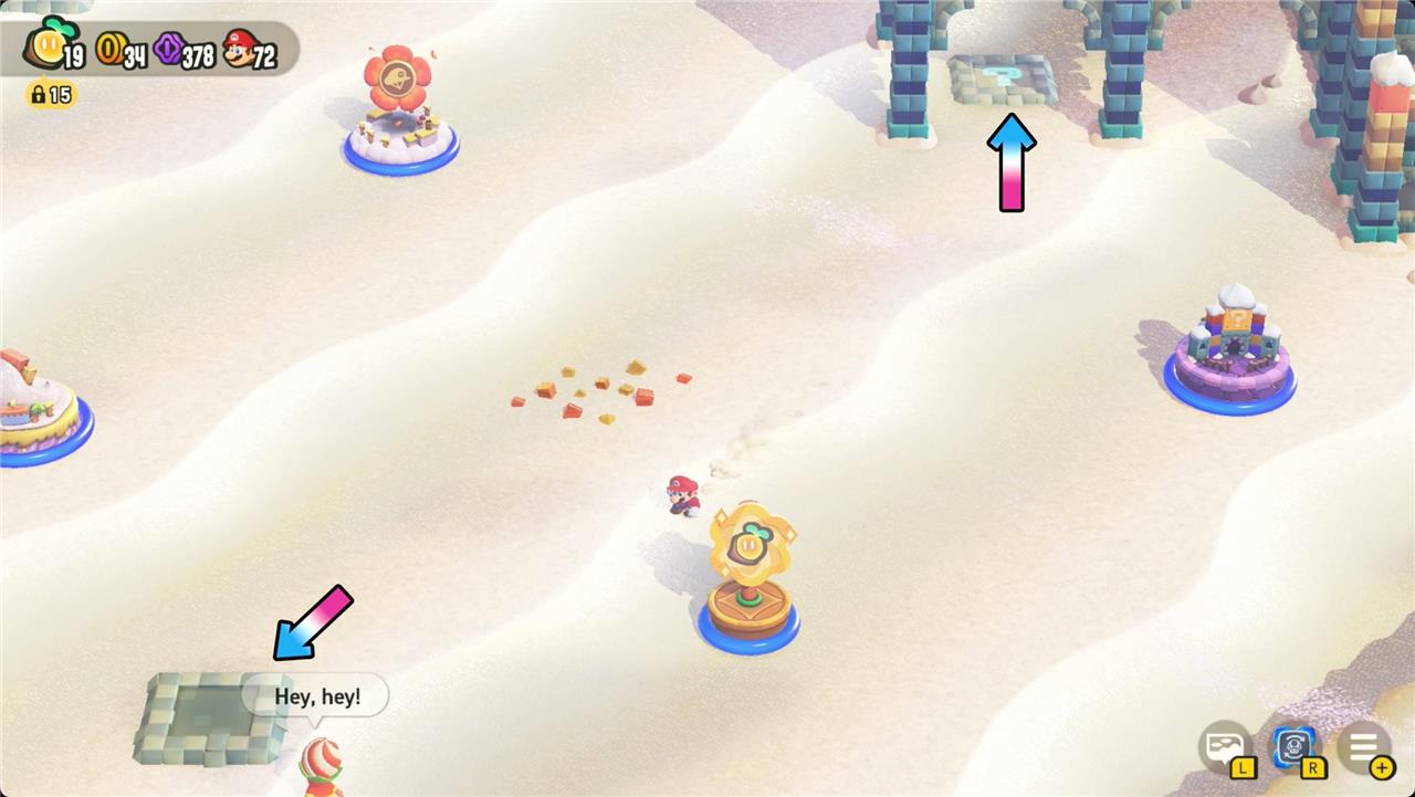 Additionally, the Sunbaked Desert features a puzzle involving standing on three ? Block buttons to open a door leading to an optional level, and a secret Poplin Shop near Bowser’s castle offering special badges and Wonder Seeds.