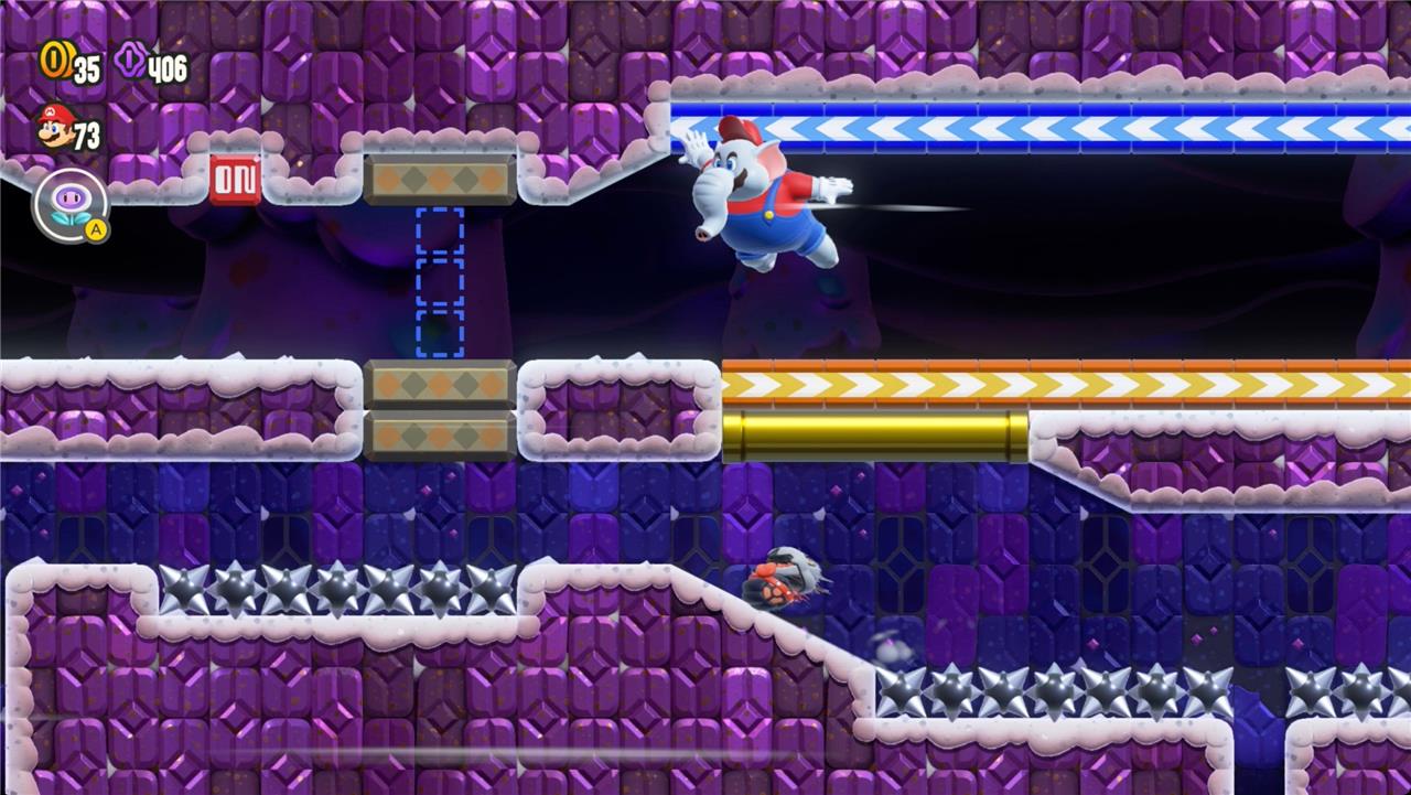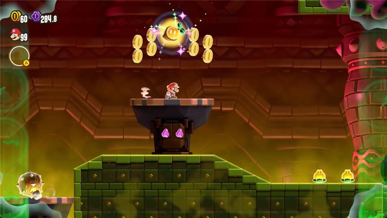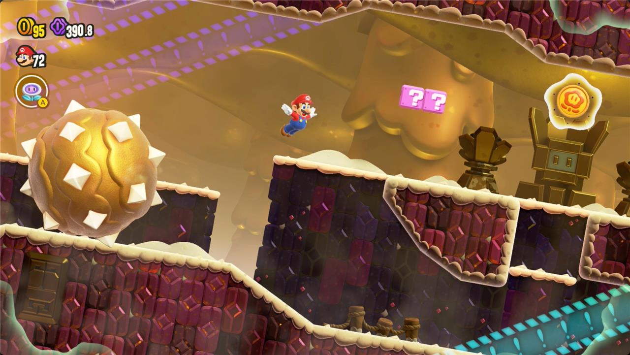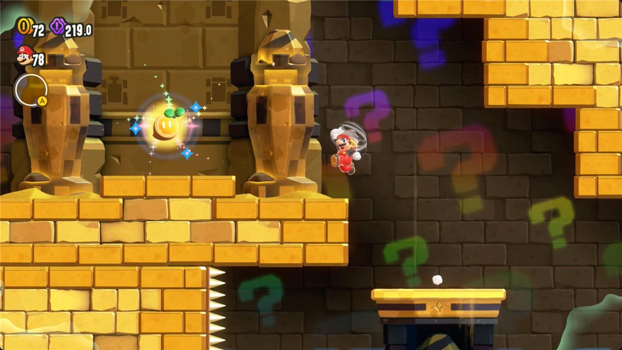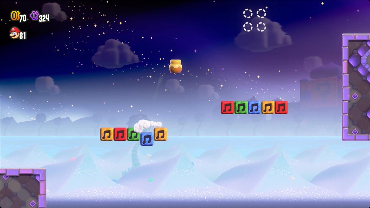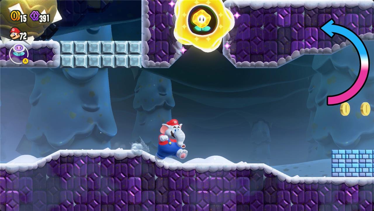 Keep heading right, and you’ll find the first Wonder Token floating just out of reach over a platform. Jump in time to the music to raise it and grab the seed.