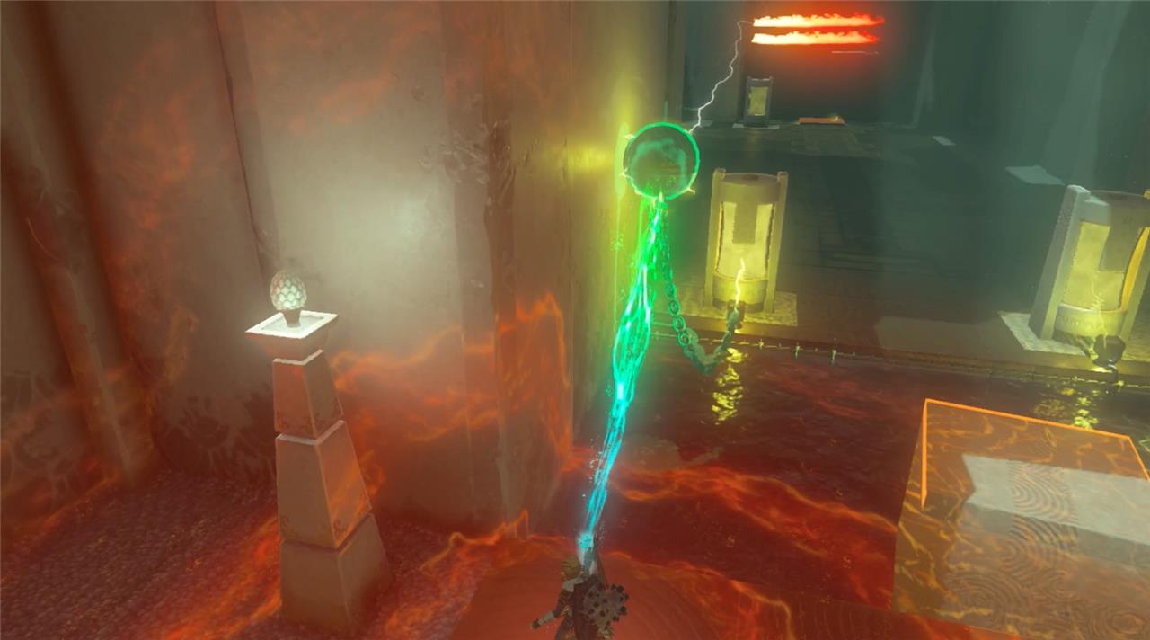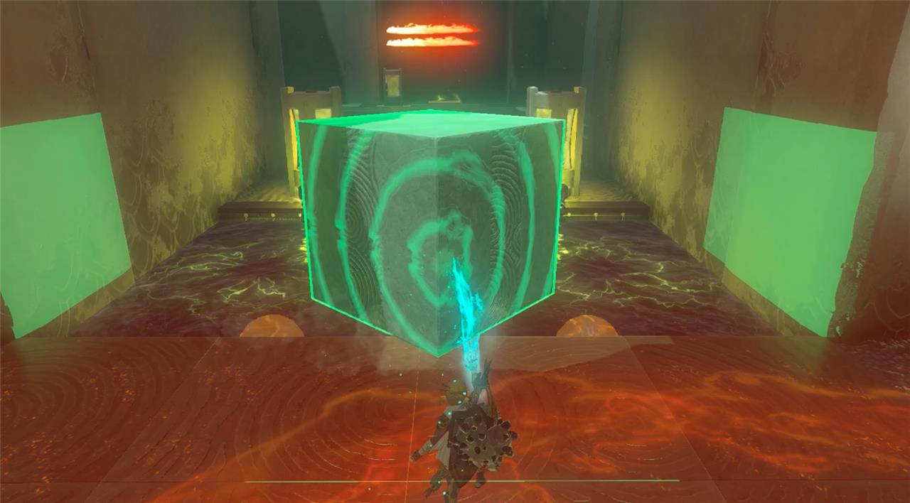 5. Next, we’ll tackle the lava pit on the right side of the room. Drag the stone cube over to the lava using Ultrahand and drop it in. It’s a little too far to clear for a simple platform jump, so use Ultrahand to glide it back and forth across the molten pool. Then, jump on the cube and use Recall to reverse the motion, creating a moving platform to the other side.