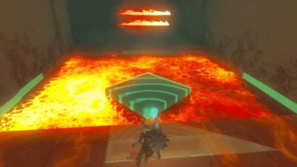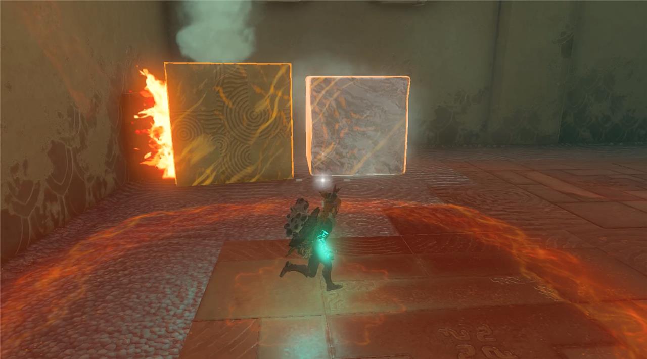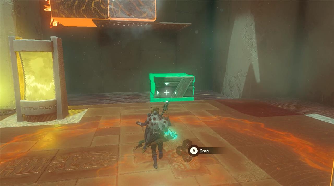 6. After crossing the lava, use Ultrahand to grab the box burning in the flame jets. Quickly slide it across the floor into the pool of water before it sizzles up.