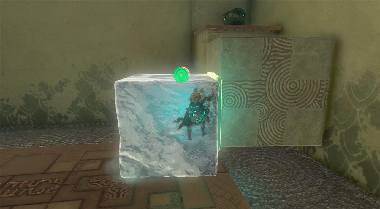 4. Grab the ice block and drag it along the wall to the chest sitting on a platform. Then retrieve the stone cube and attach it to the ice using Ultrahand. Use the makeshift stairs to hop up to the chest, which contains a Mighty Zonaite Shield.