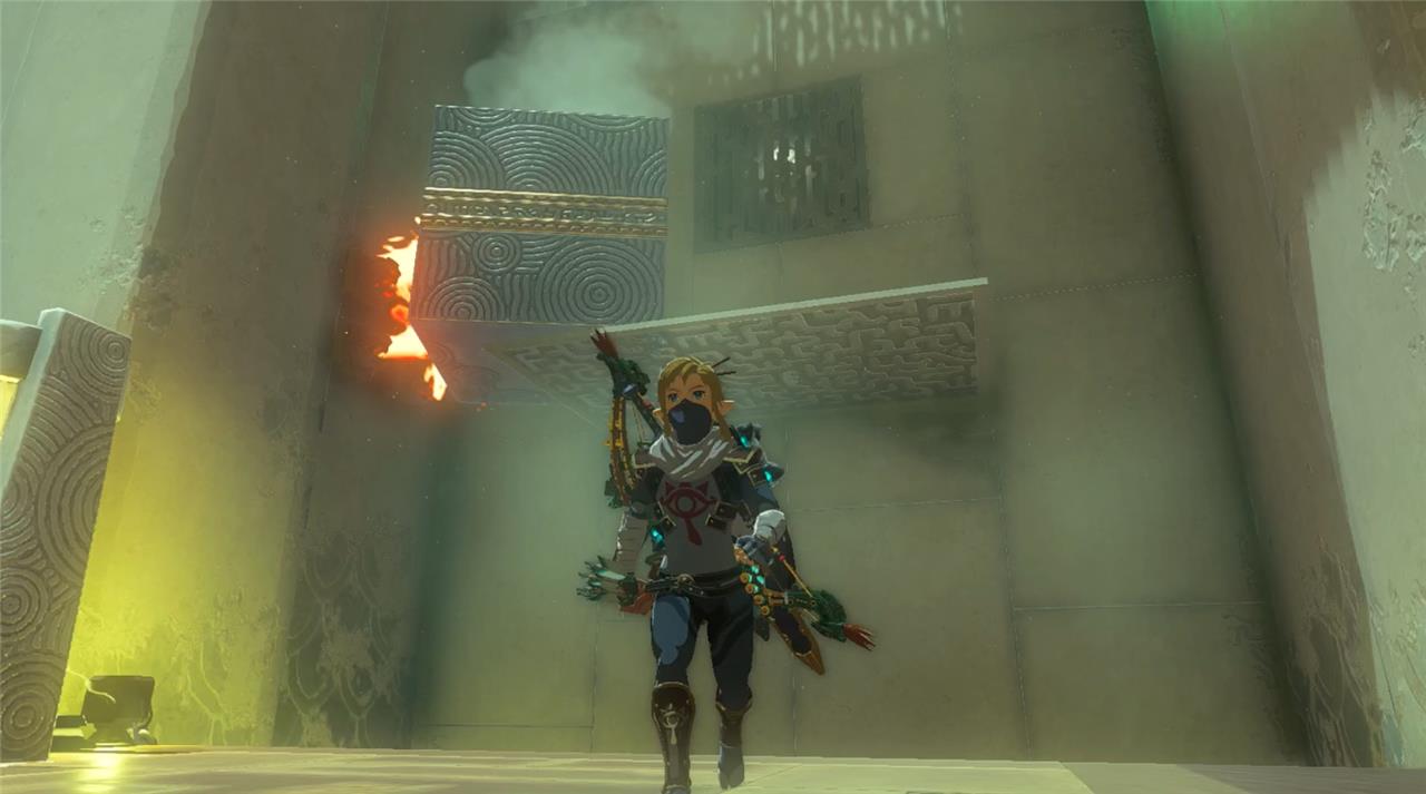 3. Retrieve the stone cube from the water and drag it toward the jets of fire to the left. You will see blocks of ice falling from a tub into the flame, where they’re instantly melted. Placing the stone cube in front of the flames using Ultrahand diminishes the heat enough for the ice to survive.