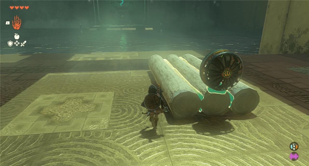 Grab four logs from the stacks near the entrance. Stack them vertically using Ultrahand to form the base of a tall raft. Attach a fan from the nearby platform to the top log’s side, facing outward. Place the raft in the water channel and activate the fan with a nearby flame source to propel it forward across the gap.