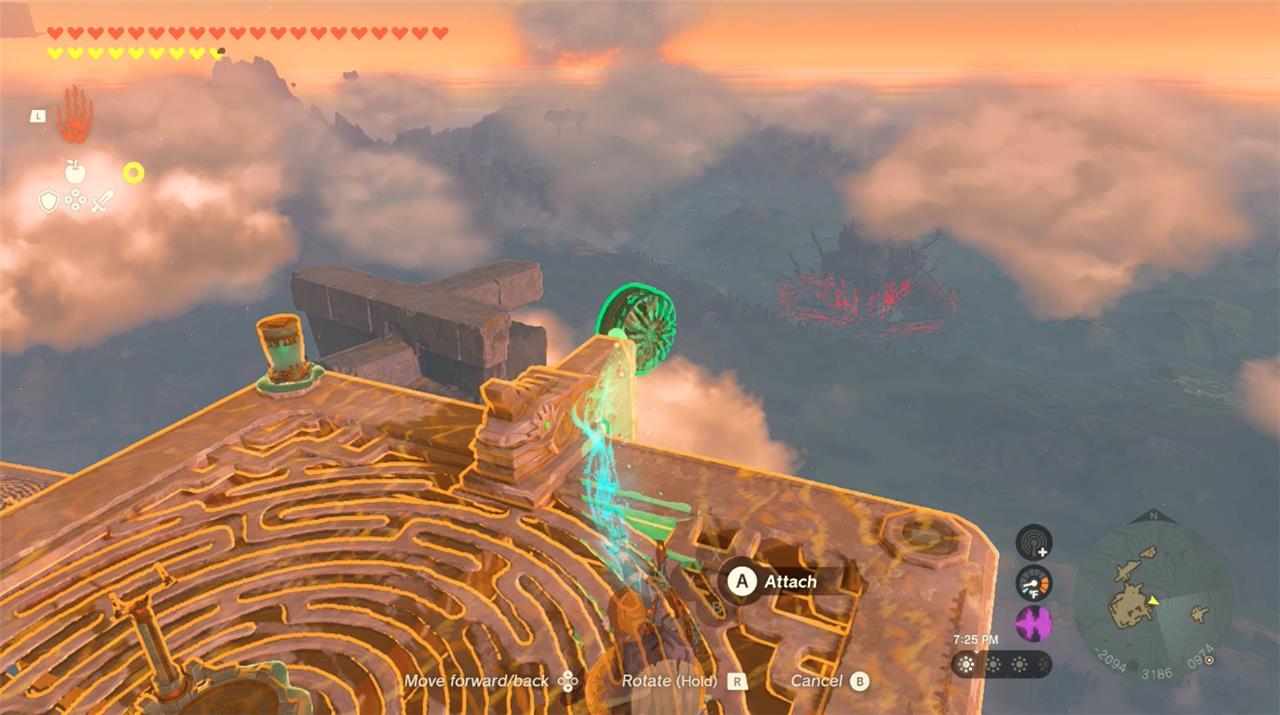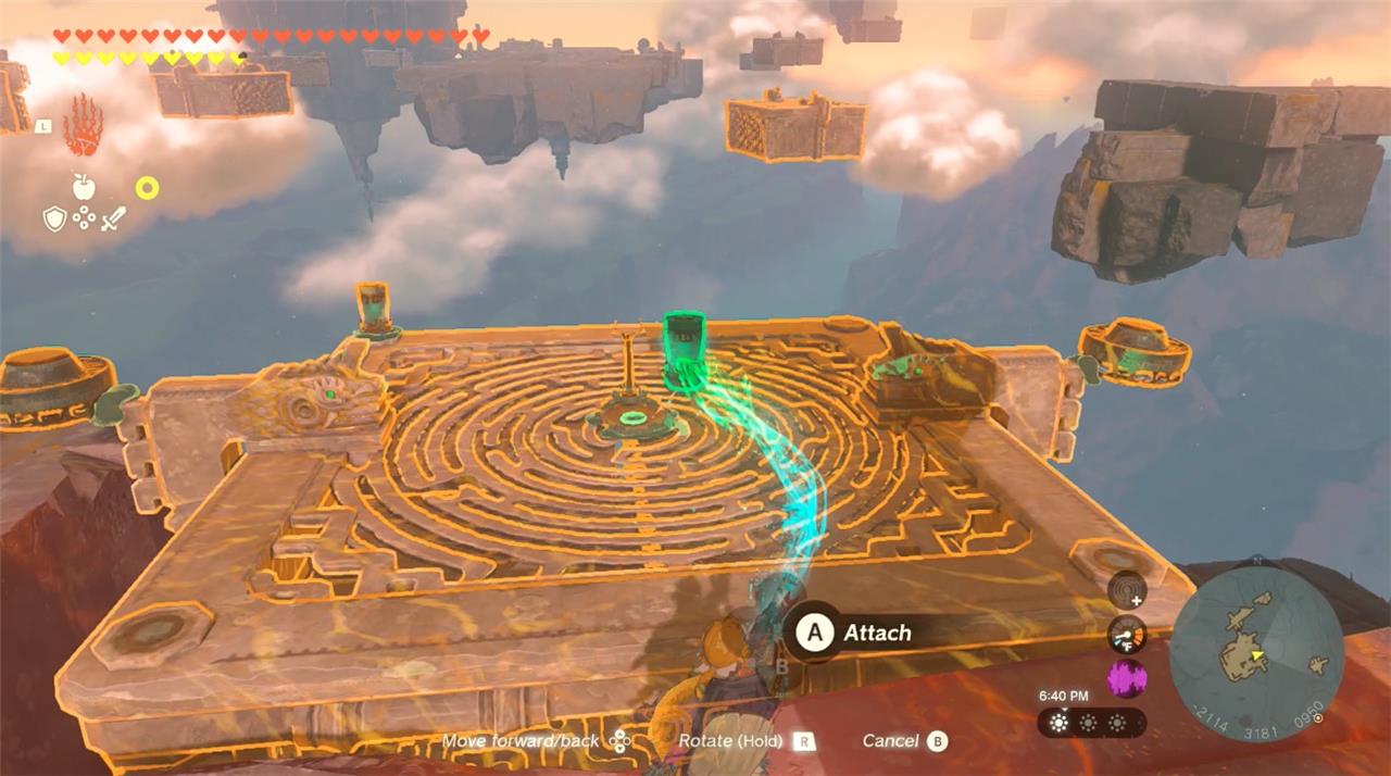 5. Climb on to the floating block craft, then steer it to the left around the island, then straight ahead to the shrine island. Grab the green shrine crystal using Ultrahand to bring it down to sigil and activate the Taninoud Shrine.