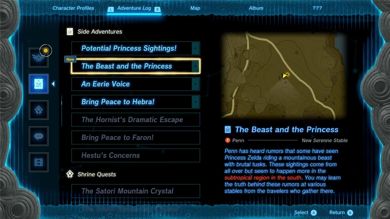 - Head to the New Serenne Stable to get a tip on Zelda’s whereabouts with some rumored beasts. (This is where “The Beast and the Princess” officially begins.)