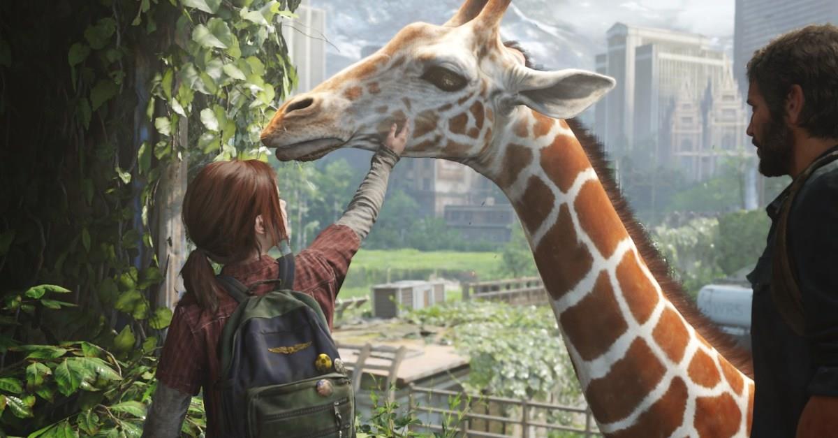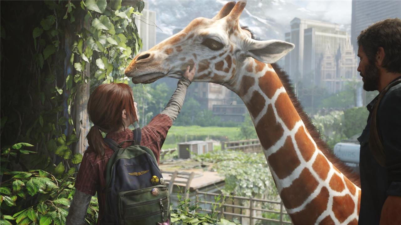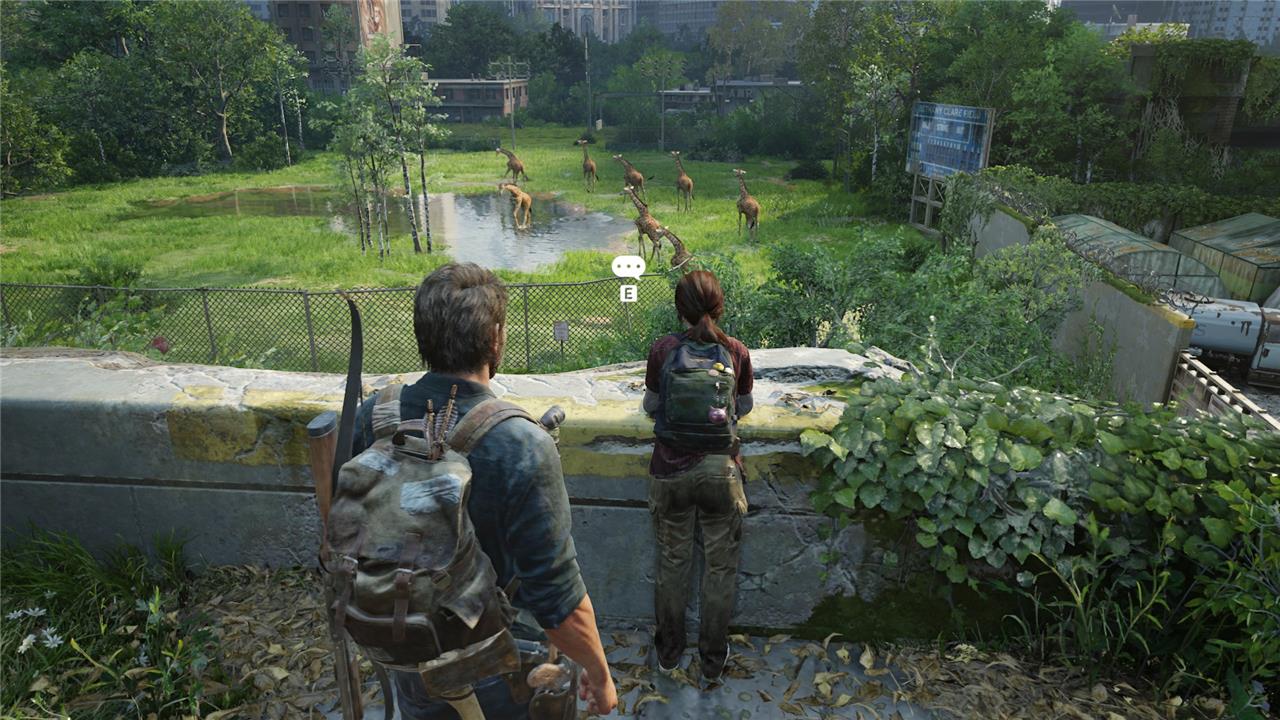 After Ellie drops the ladder down to Joel, climb up to the second floor and follow an excited Ellie, She’ll lead you to a giraffe eating some leaves off of a hole in the side of a building. Interact with the giraffe to start an optional conversation.