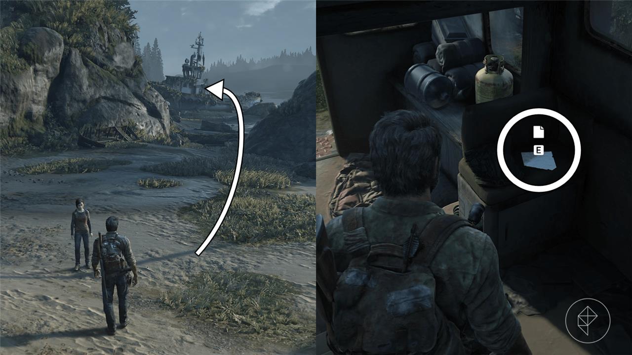 After you gain control of Joel, search inside the beached boat to find the Boat Note on top of a chair inside the cabin.