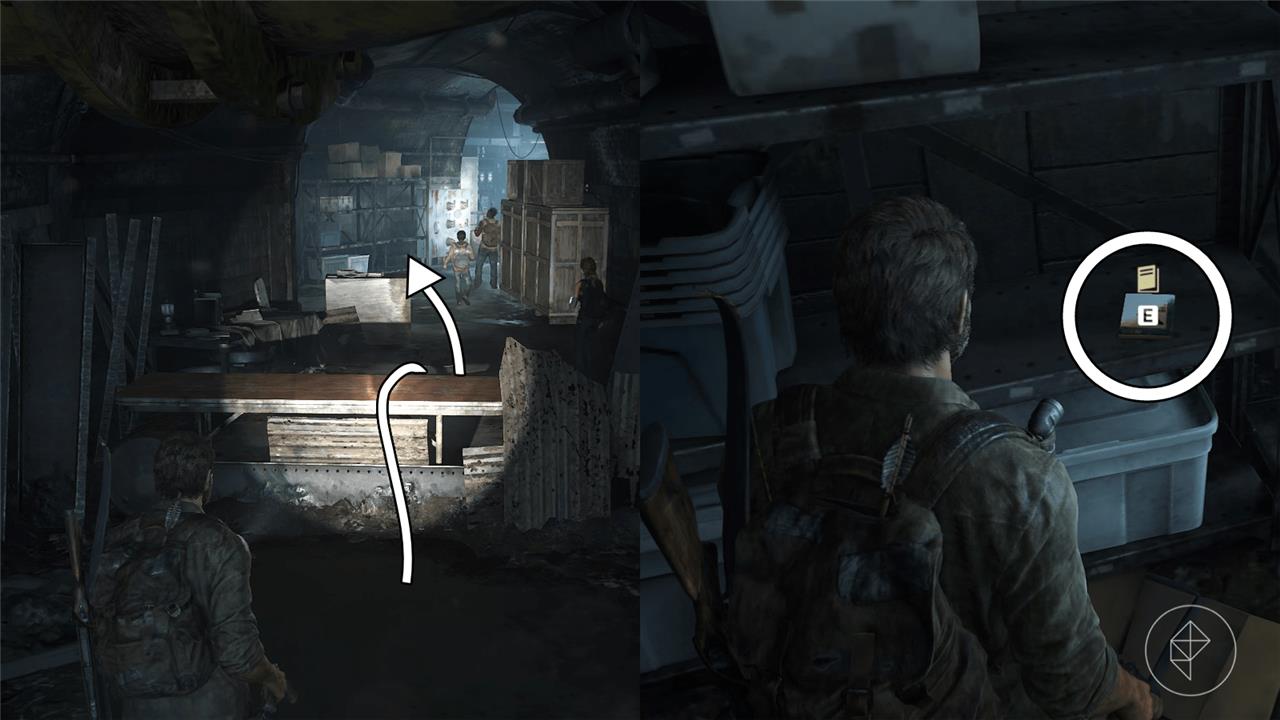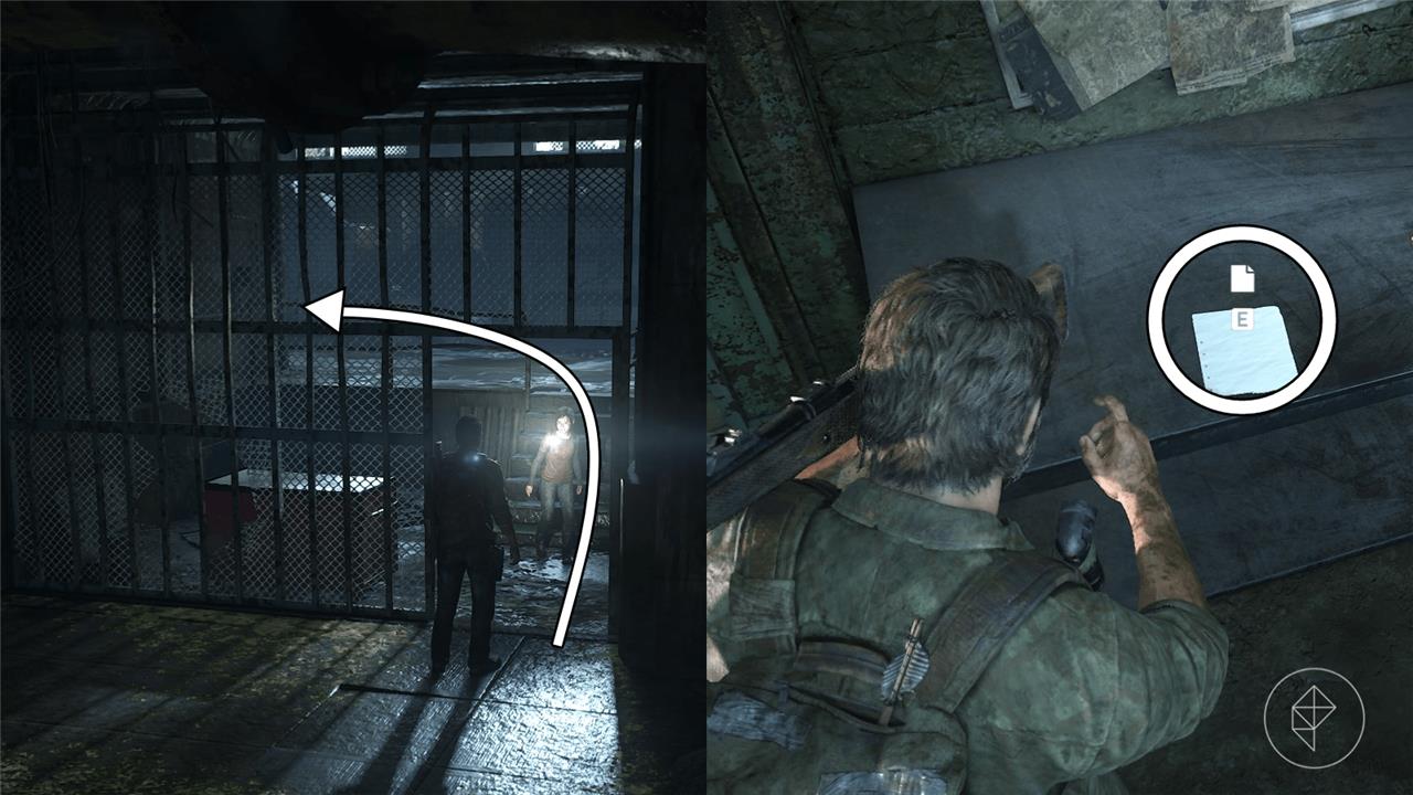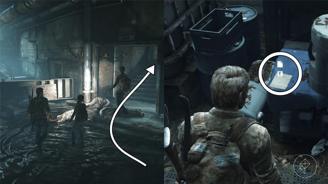 Sewers Note Artifact: At path fork, take right (Ellie unlocks door); upstairs table inside.