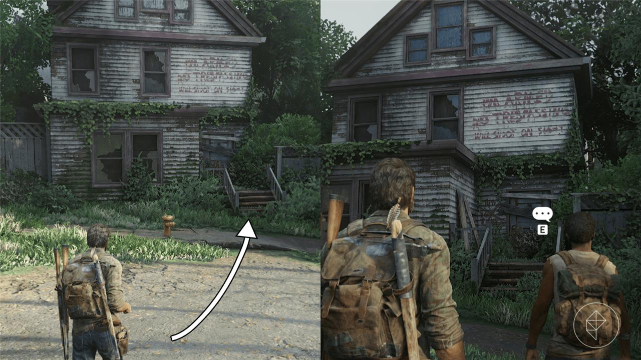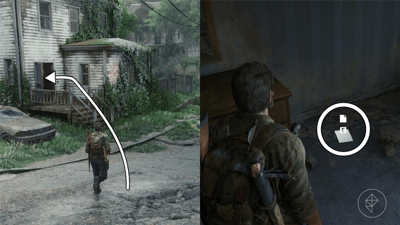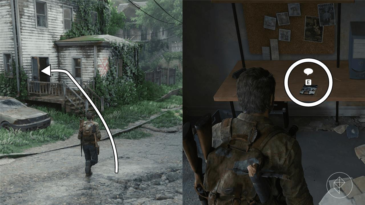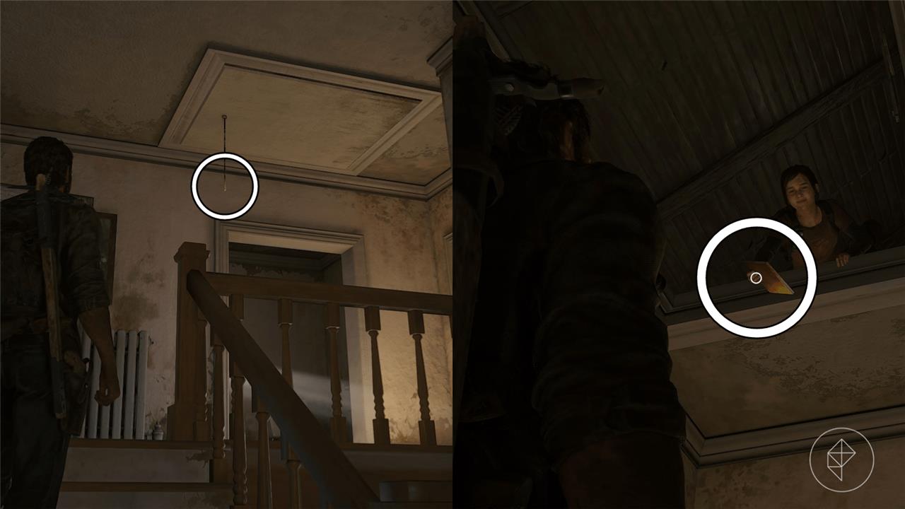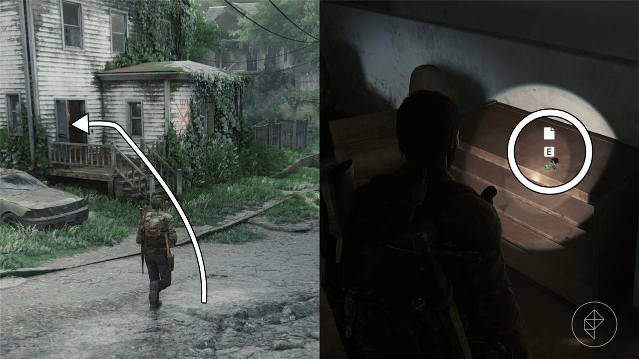 Inside the brick house, head up the stairs and interact with the attic door only for it to collapse on the ground. Hoist Ellie up instead where she’ll find and retrieve the Melee: Techniques training manual.