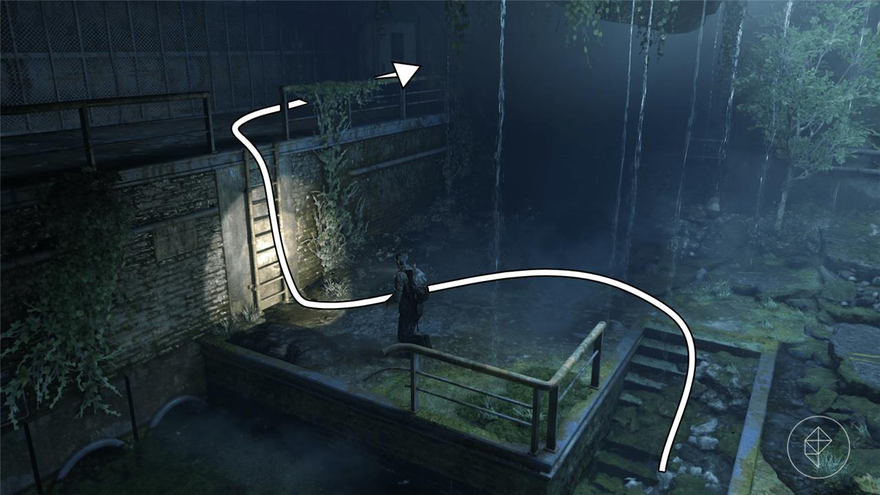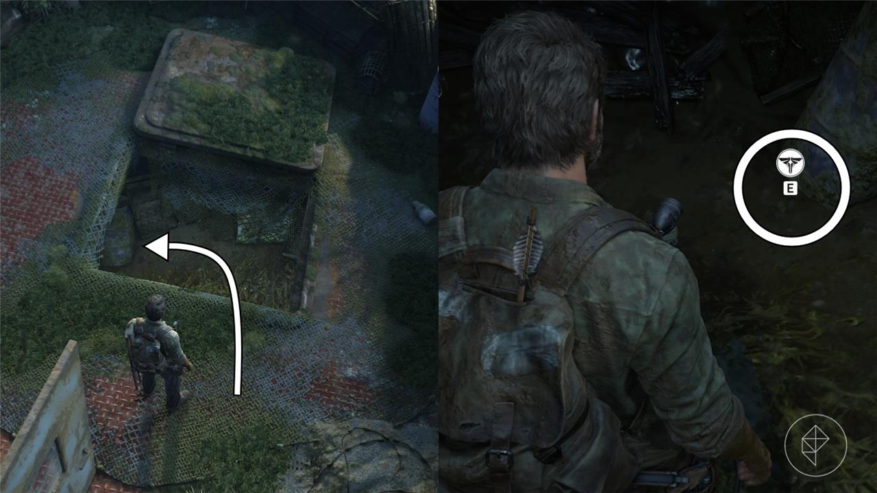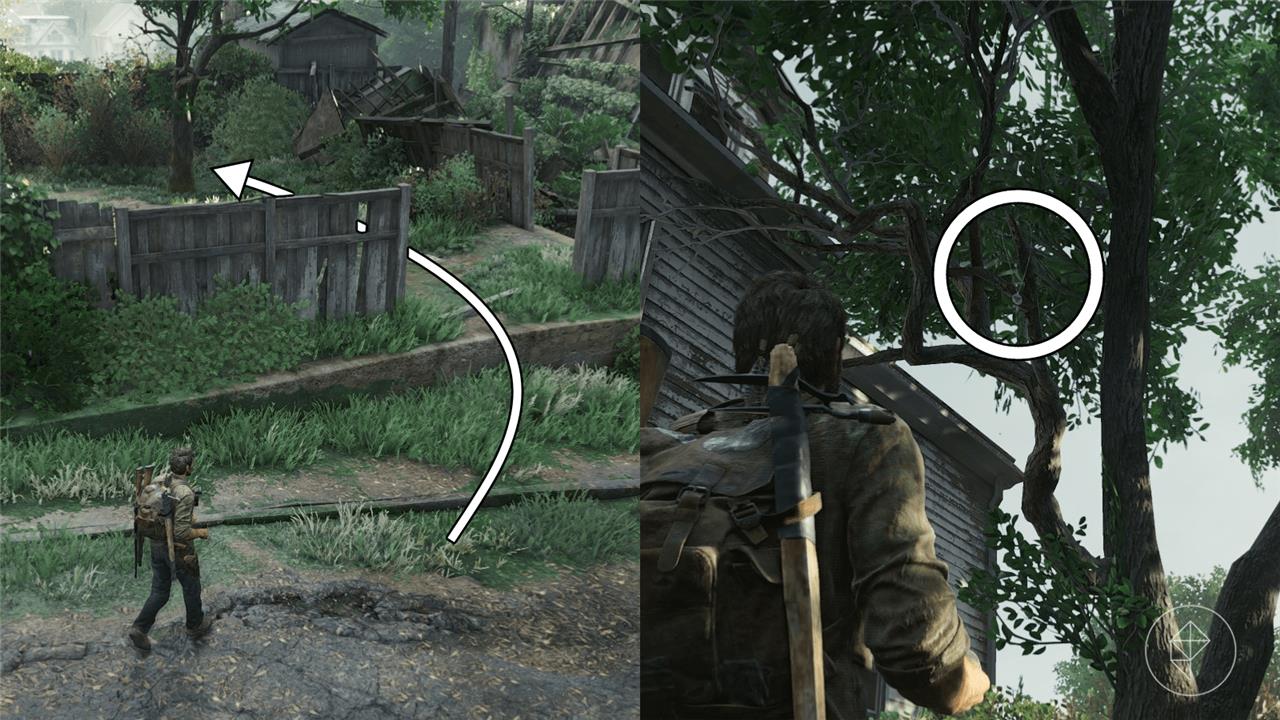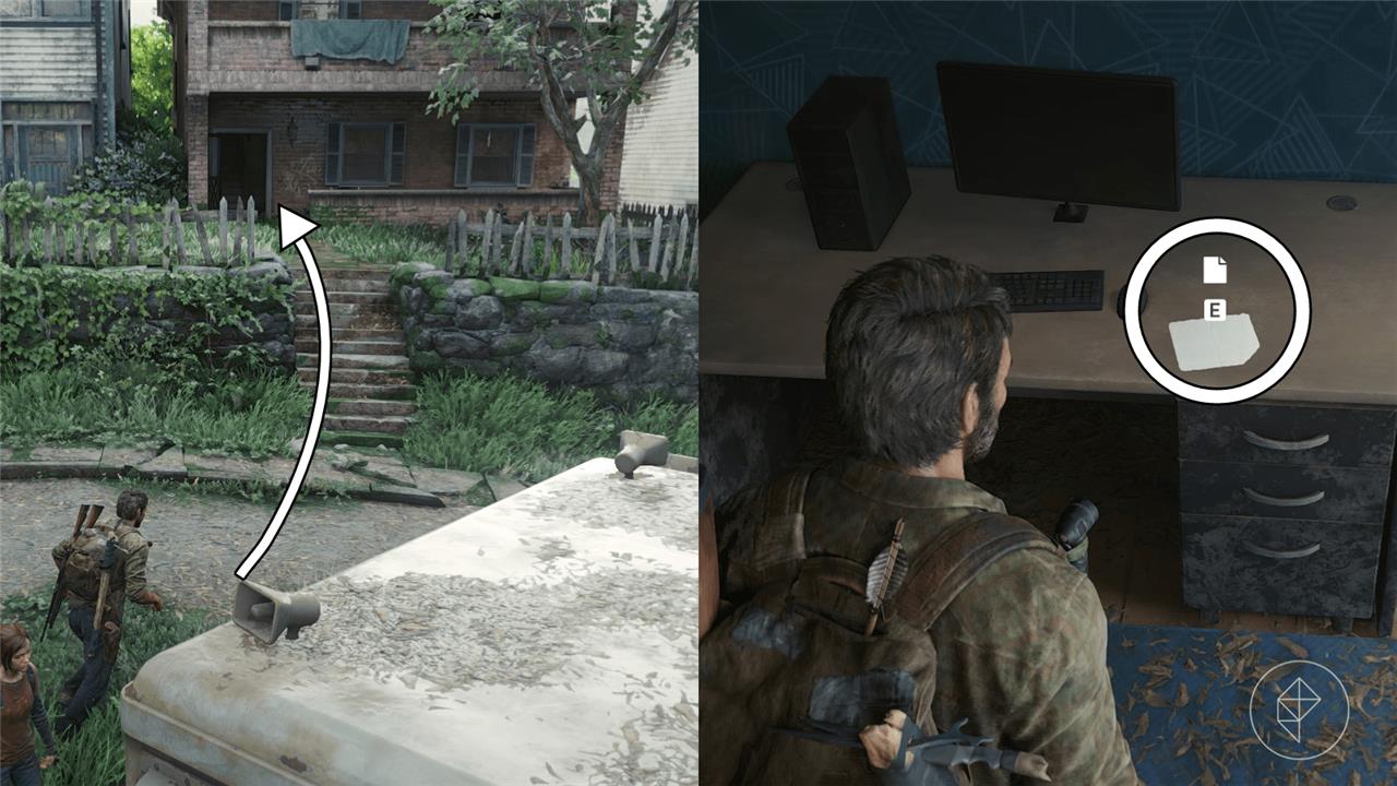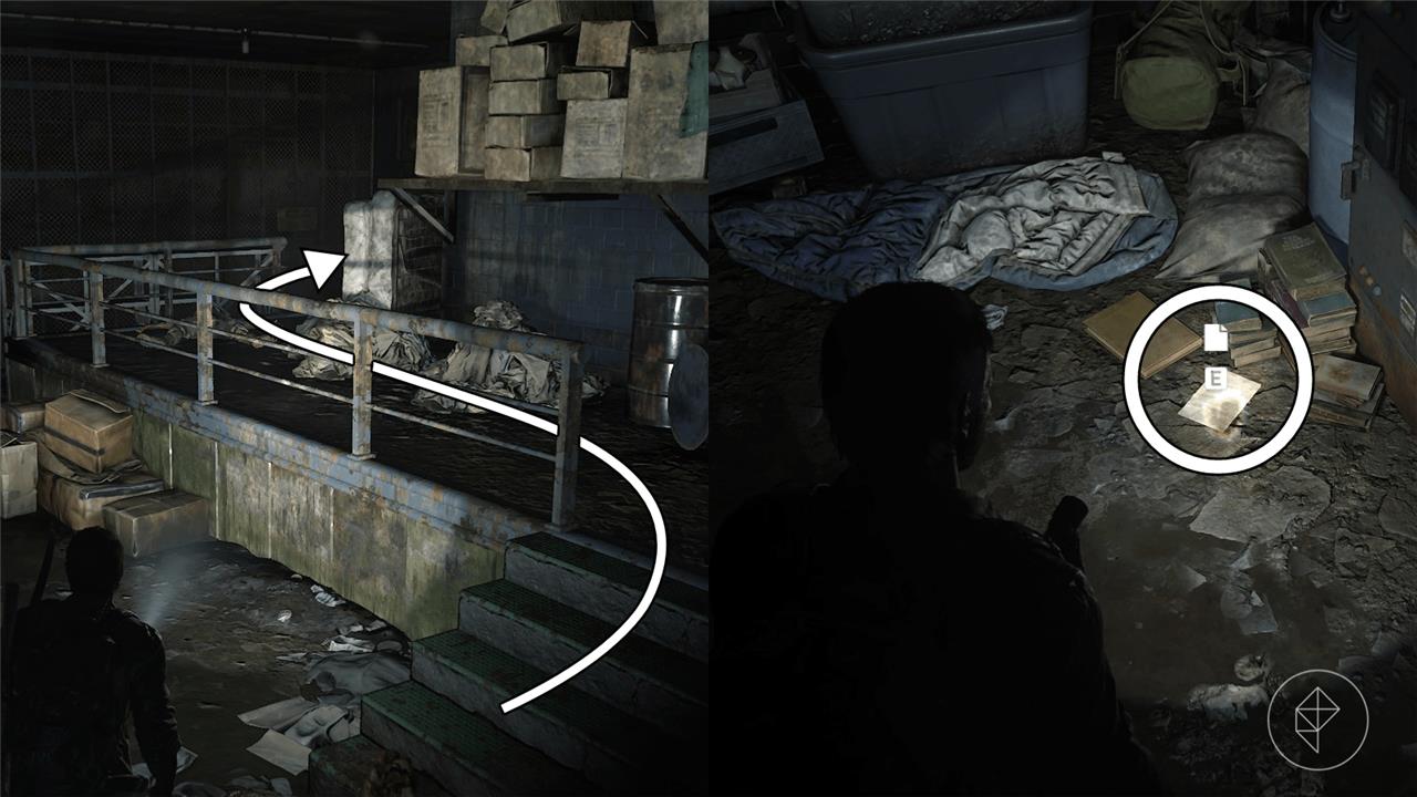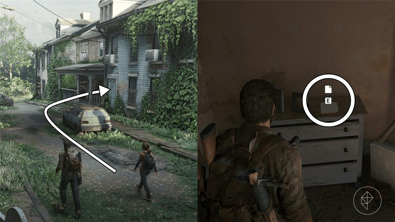 Inside the brick house, head up the stairs and interact with the attic door only for it to collapse on the ground. Hoist Ellie up instead where she’ll find and retrieve the Melee: Techniques training manual.